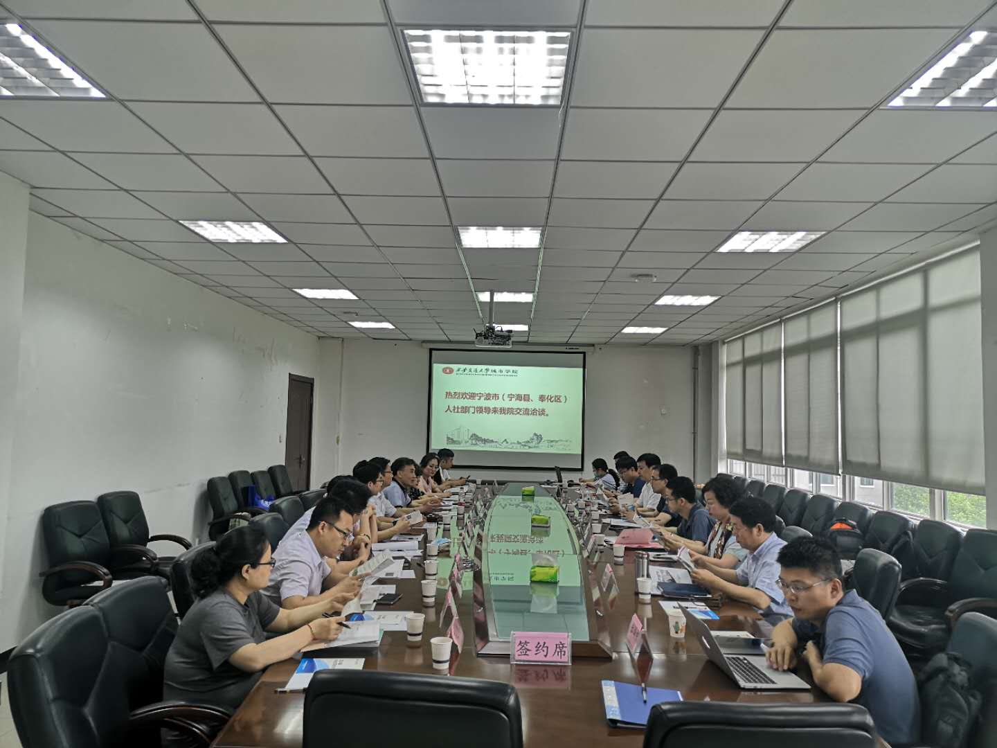 随后,胡小峰局长表示宁波宁海非常重视人才培养,从完善的校企合作、大学生实习工作等方面介绍宁海的基本概况、产业结构等具体情况。宁海县人社局专技科科长骆昌杰及奉化区人社局人才中心主任林济舟详细介绍了宁海县及奉化区当地品牌产业、知名企业、人才培养模式及人才政策等。并表示期待与我院开展更深层次的合作。