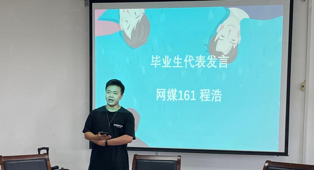 茶话会以2019级同学的一番发言拉开了帷幕。播主191班的郝梓含同学代表新生为即将毕业的学长学姐送上了祝福,接下来网媒161班的班长程浩代表毕业生发表了讲话,他表示这四年大学生活没有留下遗憾,他对老师们的悉心教导表达了感激之情。随后传播系主任刘强老师对毕业生送上了祝福,并说到希望毕业生在工作后一定要有耐心,坚持早起和终身学习。接下来是学弟学妹们为毕业生呈现出他们准备的节目,分别是魏启轩同学带来的RAP《需要保密的情话》、张讯豪同学带来的《无名之辈》、杨欣欣等同学带来的《遥远的你》。在最后一个环节,主持人朗读了同学们在茶话会前匿名写好的毕业寄语,同学们纷纷表达出了对毕业后的美好祝愿。