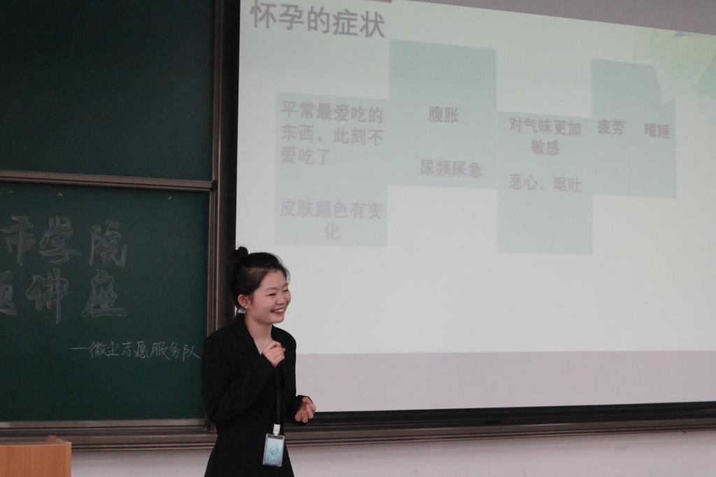 会议伊始,叶超从“什么是爱情”到“什么是性”,讲述到性教育的重要意义,打破了大家对性教育的一贯认知,帮助大家树立正确的性认知和性观念。紧接着,微尘性教育的各位宣讲员从怀孕、流产和避孕三个方面为我们深入讲解了相关性教育知识。通过讲解及观看视频,同学们明白了药物避孕和手术避孕以及其他不正确的避孕方式会给女性带来生理心理双重伤害。之后讲解员为大家介绍了正确、科学的避孕避方式,为同学提升自我保护意识。最后是考验大家所学所获的有奖问答环节,同学们在这一环节参与积极,现场氛围热闹。