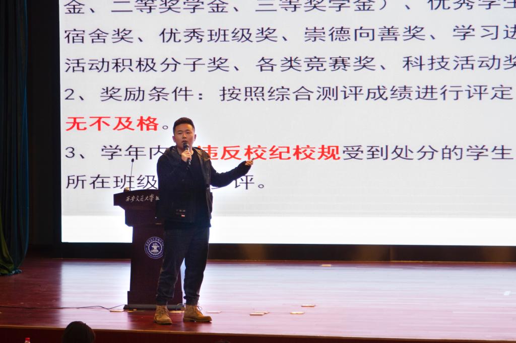 杨耀聪在讲座上分别从学生工作办公室的人员介绍、日常管理教育、入党启蒙教育,奖、助政策解读以及如何认识大学这五个方面向2020级新生们进行了详细的讲解。在讲座中杨耀聪老师告诫新生,要重视日常学习,不迟到,不旷课,认真规划大学生活,明确奋斗方向,奠定未来的事业基础。最后,杨耀聪老师还提醒同学们要关注人际关系问题,要与宿舍同学、班级同学和睦相处,并且希望大家在课余生活中能够积极参与学院的各项活动。