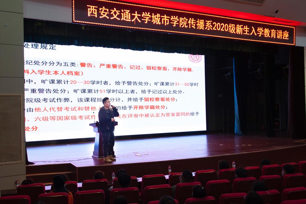 为使传播系2020级新生尽快融入大学生活,及时了解学院的各项规章制度,树立正确的学习目标。传播系于10月15日晚7时在教二多功能报告厅举办传播系2020级新生入学教育讲座。本次讲座由传播系学生工作主管杨耀聪主讲,学工办辅导员老师及全体大一新生参加本次讲座。
