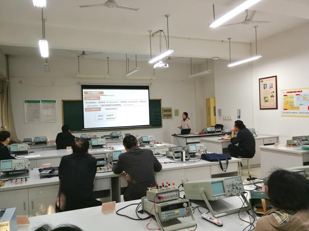 之后赵丽华针对对分课堂经验对各位老师进行了介绍与分享。赵老师介绍对分课堂是学生经系统听课以及自主消化吸收后的延时讨论,达到以学生为中心、以学生学为主的一种教学模式。通过教师讲授,学生实验前预习,生生、师生就原理方法,操作的讨论,课堂实验操作即PADO的方式,达到了预习启发、引导、反思与应用的作用。结合云班课软件,更能看清学生状态,督促进行。经过整个对分课堂教学过程学生对预习的理解掌握程度明显提高。接下来结合等厚干涉实验教学过程,进一步介绍了对分课堂教学模式的过程,并阐述了体会,经过对分课堂,更有意义,容易让学生“动起来”。