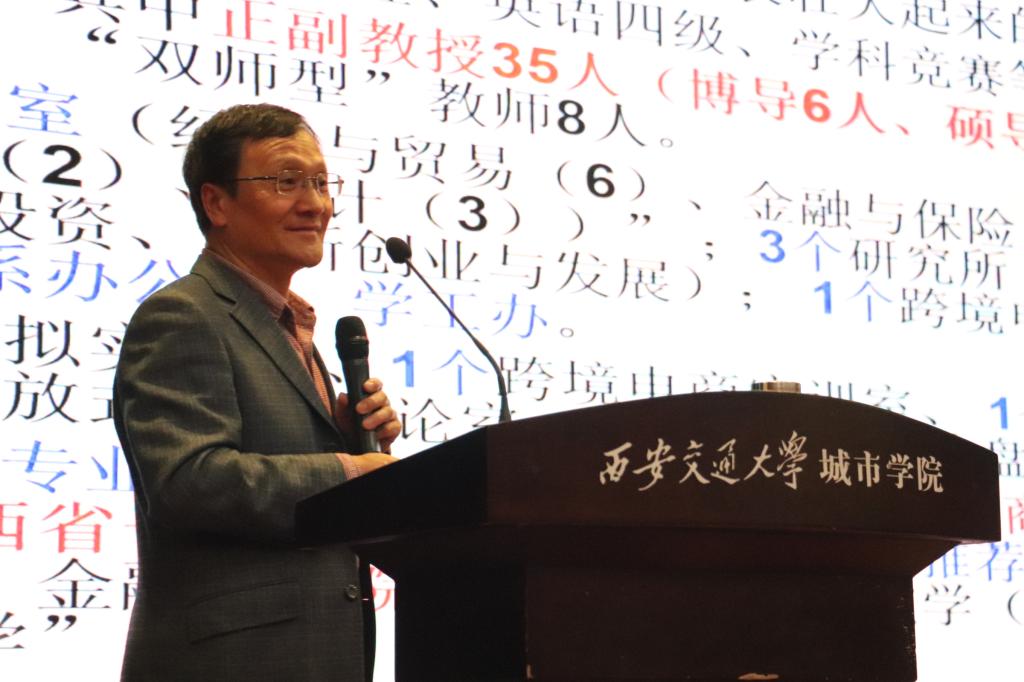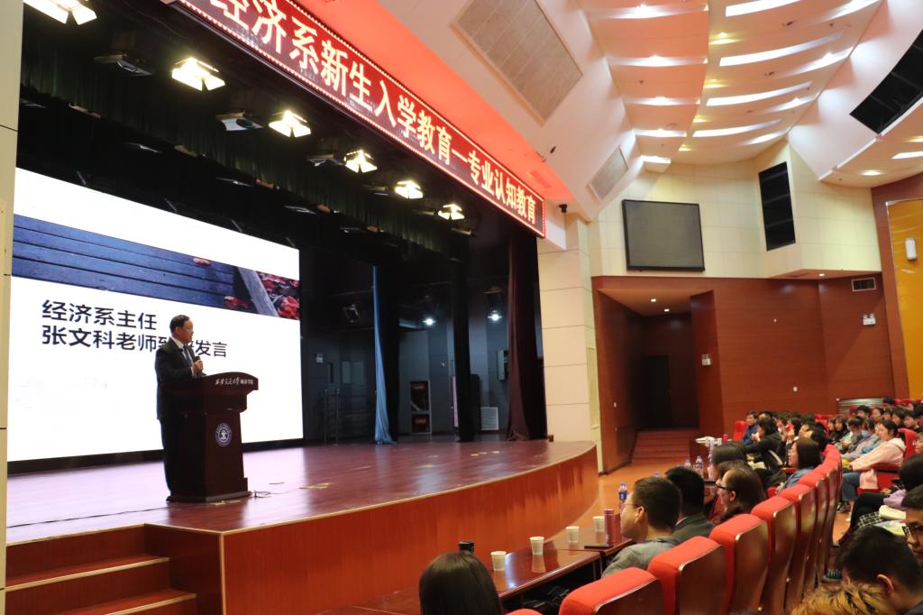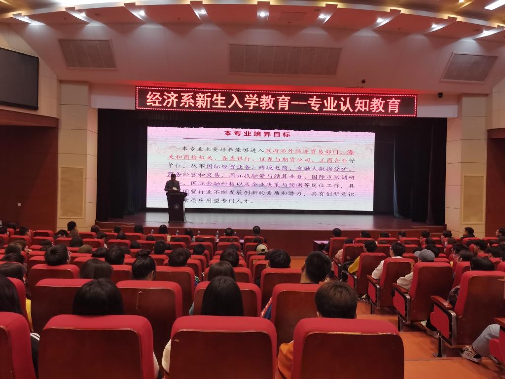 为了加强新生适应性教育,引导学生明确学习目标,了解我系各专业特点且合理进行学业、职业规划,西安交通大学城市学院经济系于10月20日在教二报告厅举行新生入学教育之专业认知教育。莅临本次大会的领导有经济系主任张文科,副主任杨健全、史冬梅、经济系主任助理张美丽,学生工作主管廉宇婷,金融专业负责人陆朝阳, 国贸专业负责人王世杰,财政专业负责人张娜,团工委书记蒋美一帆,新生班主任任远、吴慧敏、惠倩倩、刘亦璇,大一辅导员王经洲以及辅导员关天骄、汪洋、杨静怡。本次大会由张欣怡同学主持。