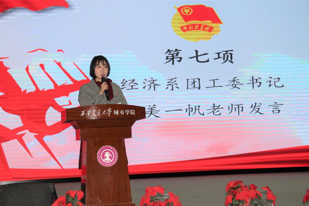 接着,经济系团工委书记蒋美一帆发表讲话,她认为学生干部不仅仅是学生中的中坚力量,更是老师与学生之间的重要纽带。蒋老师表示,学生干部应肩负起自己的责任,发扬良好工作作风,并为大家分享了她的工作感悟。她指出,学生干部应改变思想态度和学习方式,加强自身政治修养,坚定理想信念。