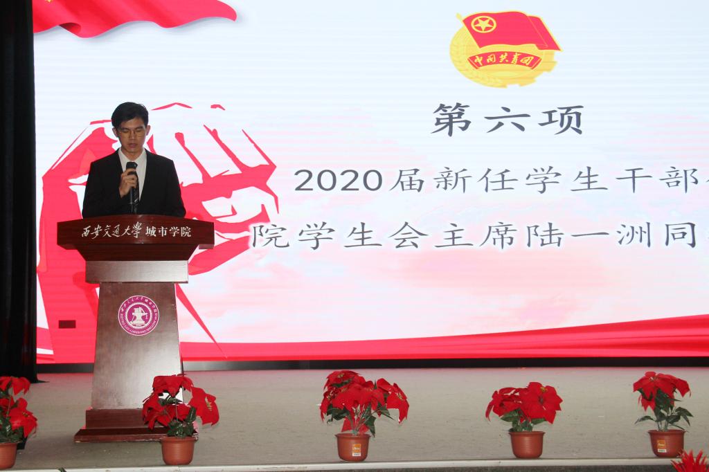 2020届新任学生干部代表院学生会主席陆一洲同学发言,他表示学生干部应从学生中来,更应走回学生中去。为加强学生会建设,他对所有新干事提出两点建议:第一,学生当以学习为重,要处理好学习和工作的关系;第二,学生干部应以身作则,加强思想理论建设。他指出,学生干部应树立为学院发展建设奋斗不息的坚定信念和高尚理想,扎根于城市学院,向阳而生。