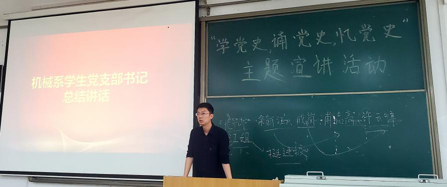 最后,机械系学生党支部书记吴昊翔老师就今天的活动做总结讲话。他表示本次活动既向低年级同学分享了党的历史故事,让同学们对中国共产党有了更深刻的了解,同时也促进了党员同志对党的进一步了解,锻炼了党员同志的表达能力,希望今后能继续坚持举办党史宣讲活动,让越来越多的同学对我们党有更加深刻地了解。