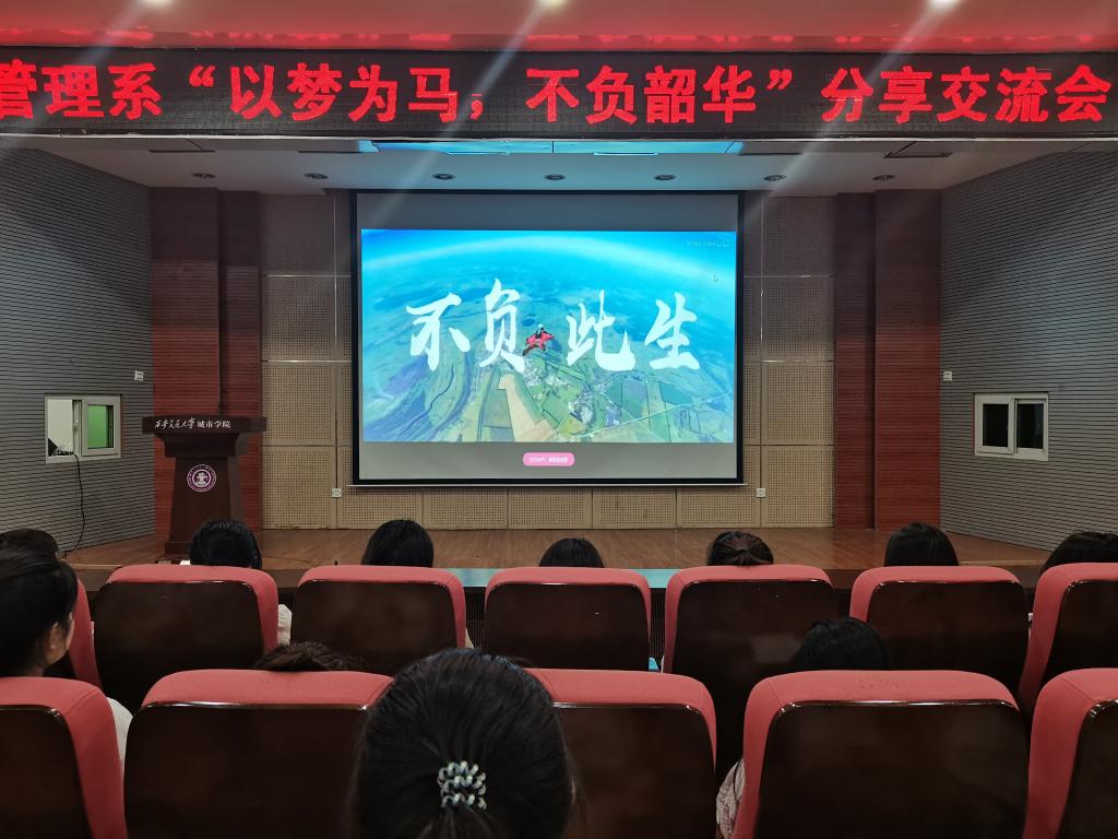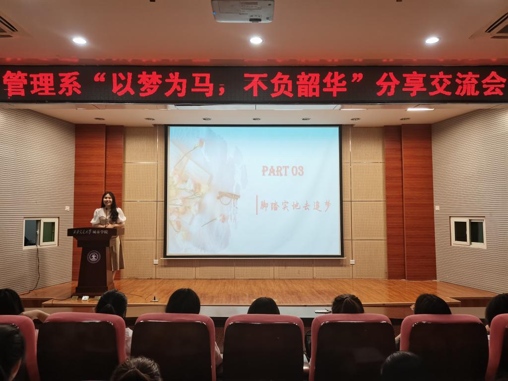 为了增强同学们的成长自信心,激发同学们的追梦情怀,西安交通大学城市学院管理系于5月25日晚在F100报告厅举办“身边的榜样(第六讲)——以梦为马,不负韶华”分享交流会。出席本次分享会的有主题分享者丁娅楠、杨家兴、杨逸尘、郝梓含及管理系2020级全体学生。本次分享会由管理系社团工作部李柯瑶主持。
