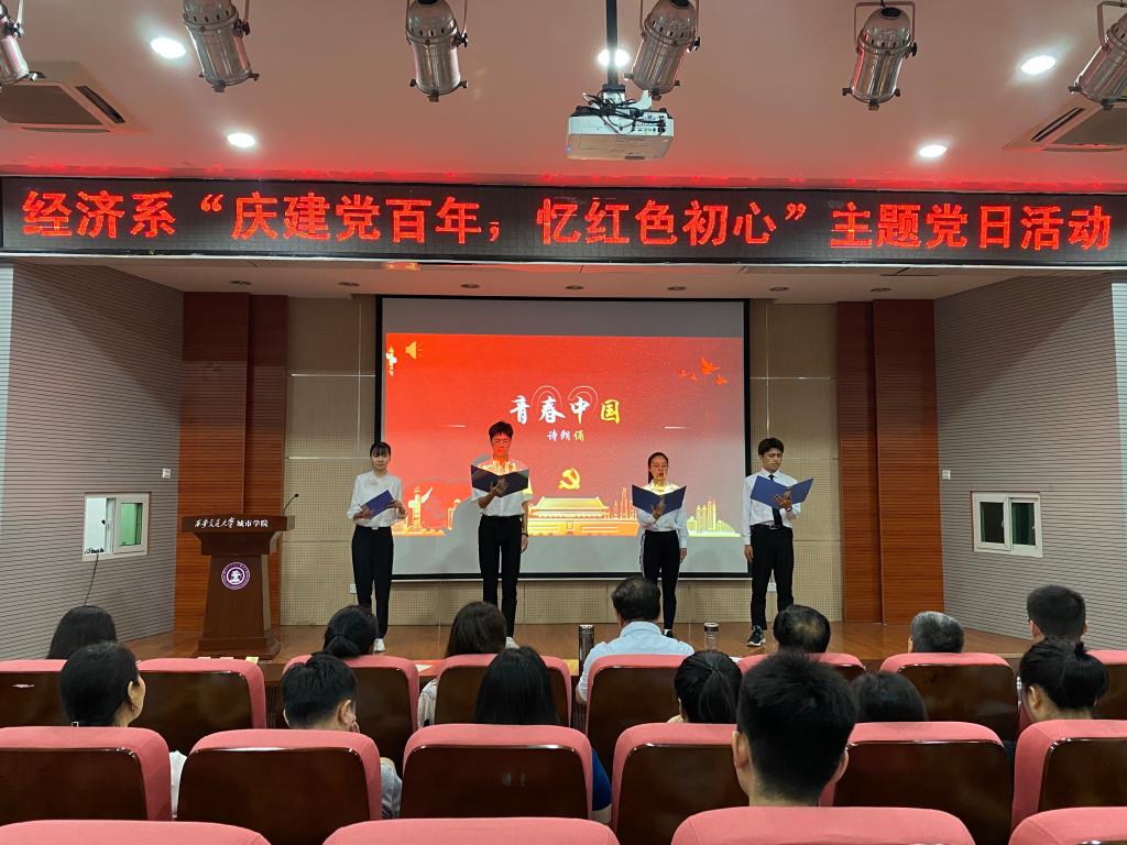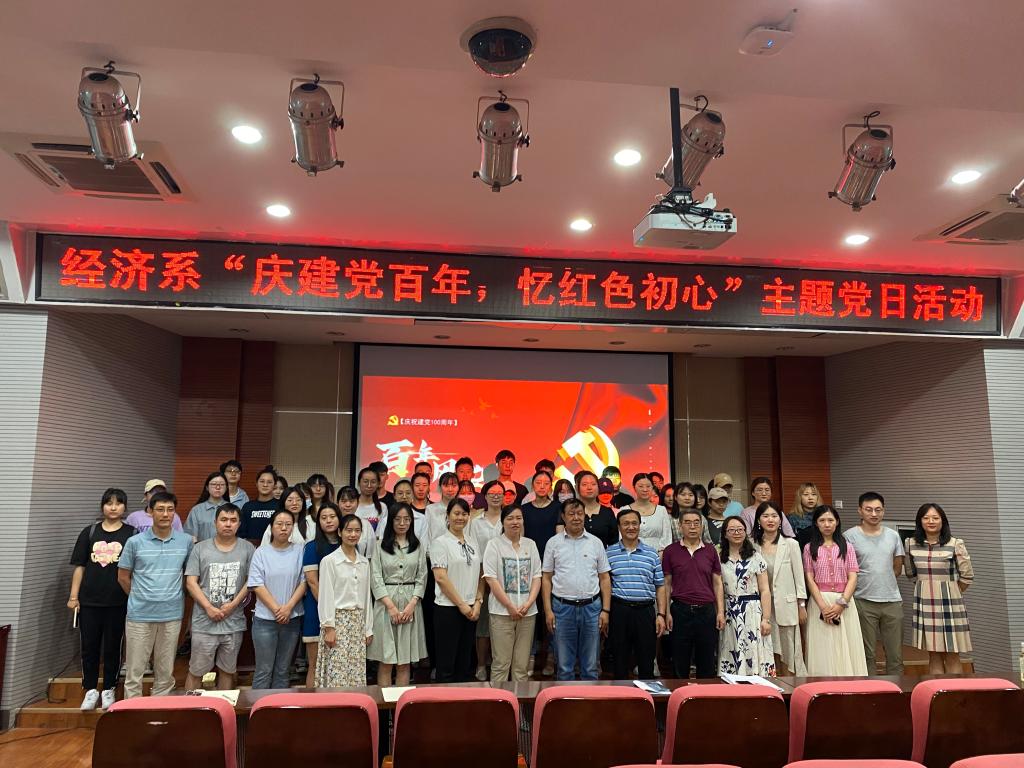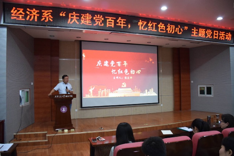 活动伊始,教工党支部书记白丹带领全体师生重温入党誓词,重忆入党初心。接着由经济系主任张文科带来了“庆建党百年,忆红色初心”的主题党课,他为我们讲述了中国共产党披星戴月、日夜兼程、风雨无阻带领中国人民实现从站起来到富起来再到强起来的伟大的历史飞跃进程,而作为新时代的青年,更应肩负起时代使命,在担当中历练,在尽职中成长。随后由经济系学生党支部的同志们带来了诗朗诵《青春中国》,句句铿锵有力、深情感人。接着大家一同观看《峥嵘岁月,百年征程》纪录片,回顾党的光辉历程,学史力行。最后学院党委委员杨健全进行总结发言,他强调一部百年党史,就是一部践行党的初心使命的历史,作为一名共产党员要了解党和国家事业,与时俱进、无私奉献,学习党的优良传统,发扬党的艰苦奋斗作风,服务师生。本次活动在全体师生《没有共产党,就没有新中国》的合唱中落下了帷幕。