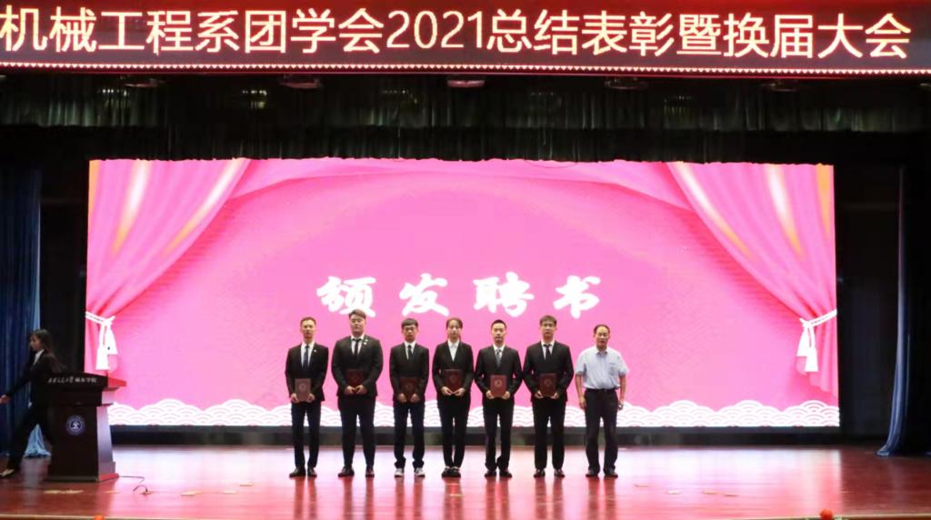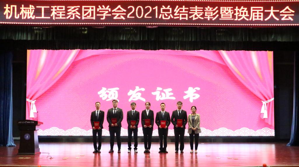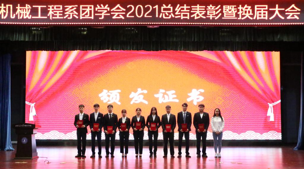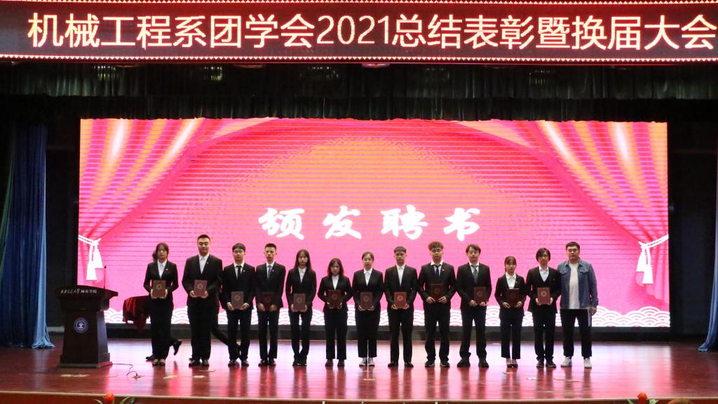 大会第一项在主持人介绍完到场嘉宾后正式开始,全体起立奏唱中国共产主义青年团团歌。第二项,由机械系团工委书记崔佳楠对2021-2022学年团学工作进行部署并宣读第十四届机械工程系团学会优秀成员名单以及第十五届团学会成员名单。接着,在场的各位老师分别为团学会优秀干部及主席团成员颁发奖状与聘书。第四项,第十四届优秀团学干部代表王菲同学发言,她表示在自己两年的团学生涯中,受益颇多,掌握到了有用的技能;接着第十五届主席团代表丁松浩同学发言表示,将一如既往的发挥机械工程系团学会的优良传统,服务师生。