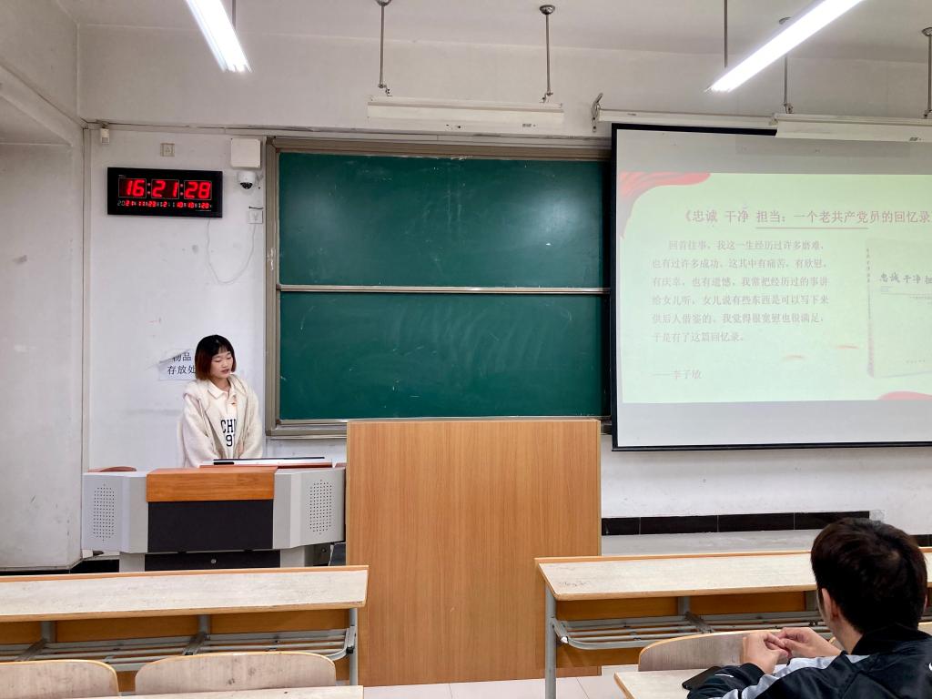 传播系学生党员做读书分享。首先由马欣怡同学就《忠诚、干净、担当:一个老共产党员的回忆录》进行读书分享。马欣怡同学介绍到,这本回忆录主要记录了共产党员李子敏人生中几个重大阶段,即在青年时期入党,历经抗日战争以来到改革开放初期党的革命与建设,体现了以李子敏同志为代表的老一辈共产党人爱国爱党的担当精神、坚定的理想信念和共产党人应有的初心和使命。