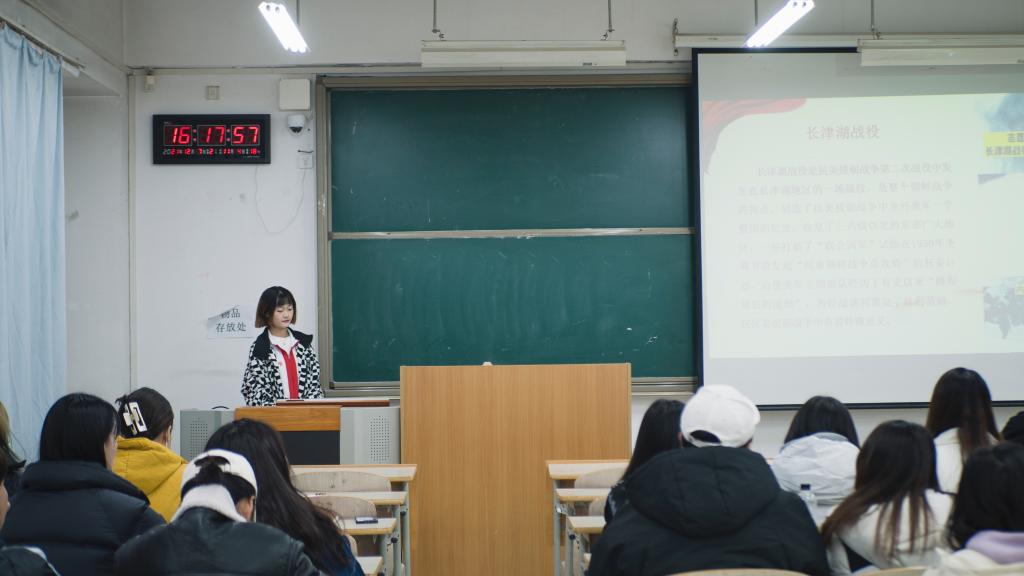首先,学生党员马欣怡就《冬与狮》一书进行分享。她通过讲述长津湖战役中幸存老兵的故事,向大家展现了千千万万志愿军战士对革命的忠诚精神。她表示,我们生逢盛世,要始终铭记不畏艰苦困难的革命乐观主义精神。