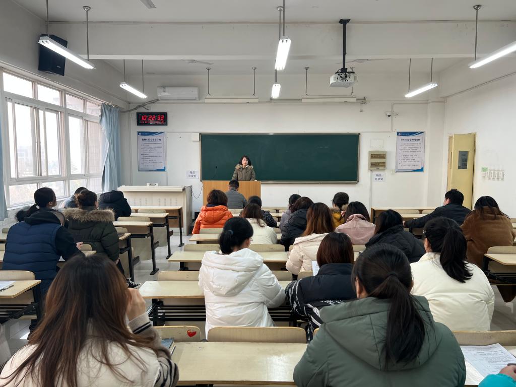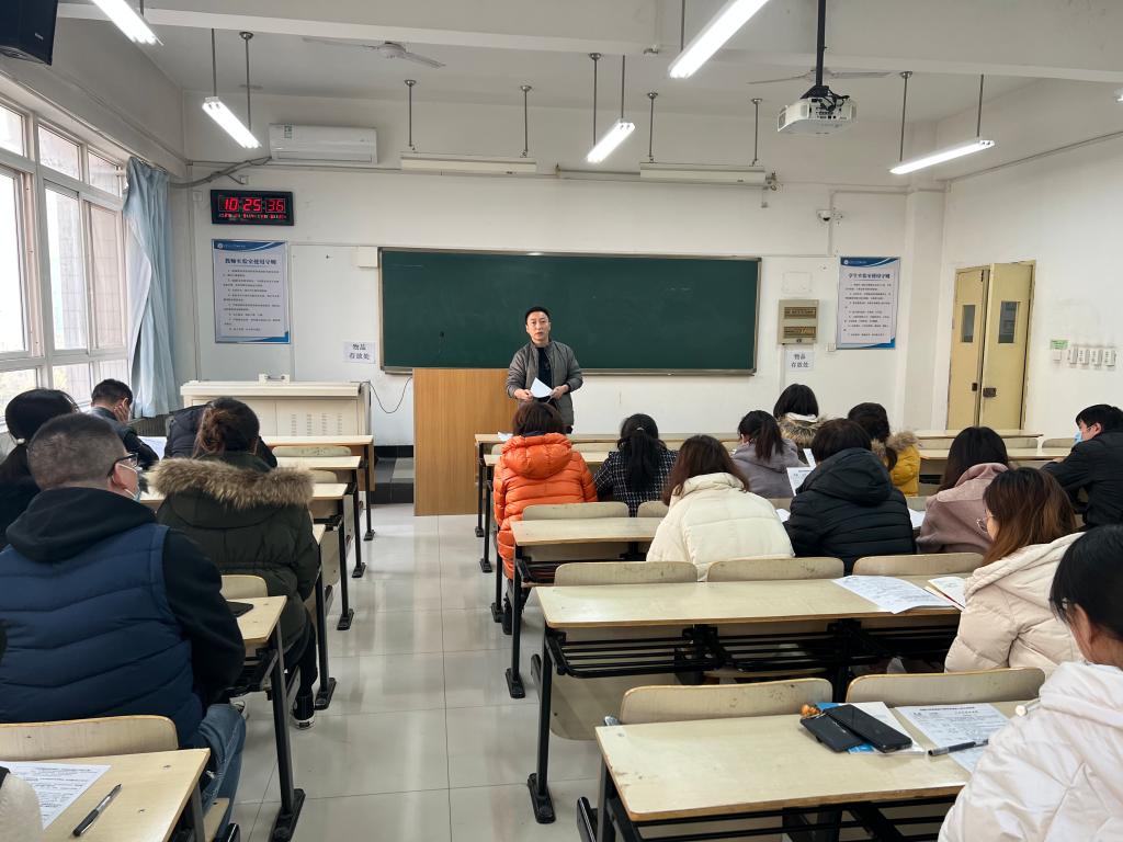 袁晓蕾首先强调,此次大学英语四六级考试,是我院首次作为独立考点组织的全国大学英语等级考试,具有十分重要的意义,教学服务中心为确保本次四六级考试的工作万无一失,从学院各个单位抽调了部分老师担任本次四六级考试的考务工作人员,在此对学院各部门支持教学中心的工作表示感谢,并对本次担任四六级考试中的考务工作特别强调几点注意事项:首先是请所有考务人员高度重视,认真对待,熟悉考试流程和考务工作安排,切实履行好维护考场秩序的责任;二是本次考务工作在具体时间节点、任务要求与以往的四六级考务工作有些许区别,提请考务人员特别注意,共同协力配合完成考务工作;三是要熟悉应急预案,在遇见突发状况时,及时报告、通力配合、妥善处理,确保考试顺利进行。
