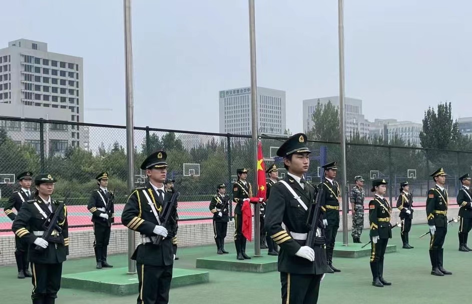 上午7时,学院国旗护卫队全体队员迎着朝阳,踏着矫健步伐,庄重地护卫着国旗进场。当庄严雄壮的《义勇军进行曲》奏响时,擎旗手振臂一扬,鲜艳的五星红旗冉冉升起,在微风中猎猎飘扬。全体师生庄严肃立,向国旗行注目礼,共唱国歌。