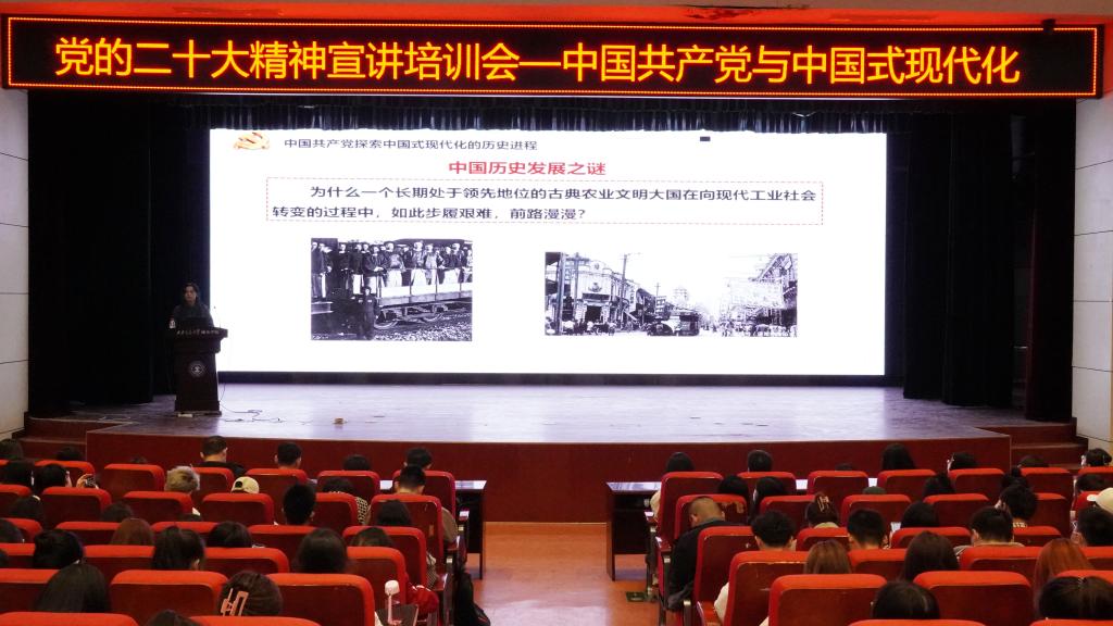为进一步贯彻落实学习党的二十大精神,把青年思想统一到党的二十大精神上来,将青年力量凝聚到党的二十大确定的各项任务中来。学院团委于2023年3月22日在教二报告厅举办党的二十大精神宣讲培训会。本次培训特邀请到我院思想政治理论教学部副教授、主任助理常媛老师做题为《中国共产党与中国式现代化》主题讲座。“城市之光”学生宣讲团、各系团员代表、团学干部代表及青年代表等400余人参加本次培训。刘梦怡同学担任本次活动主持人。