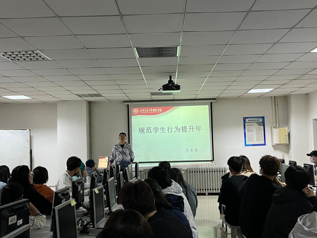 活动中,艺术系学工办全体老师分别对学生党员,学生干部及大一至大三学生召开主题班会,集中学习了《关于开展“规范学生行为提升年”教育实践活动的通知》。从活动的初衷、活动的意义及行为文明、宿舍文明、网络文明等方面展开讲解,让同学们能够充分认识到大学生行为规范的重要性,促使同学们能够养成良好的学习习惯,生活习惯。