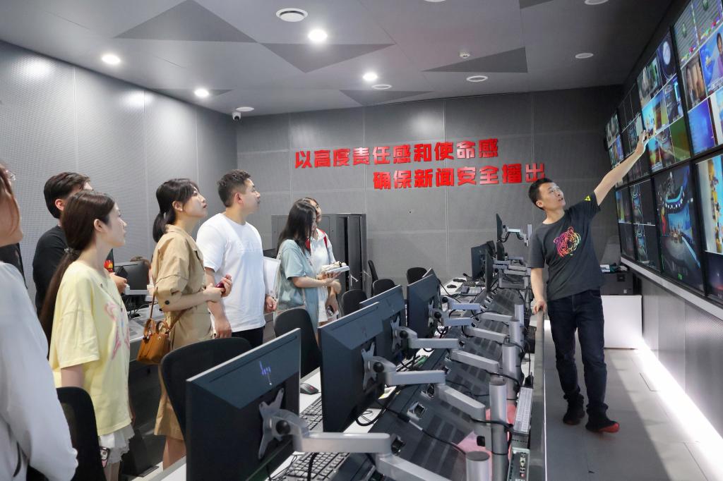 同学们在企业老师的讲解下走进融媒体制作中心,深入了解新闻节目制作流程。进入直播监控室,通过直播大屏的展示可以充分看到直播时的整体情况。站在二楼的圆环走廊上,俯视新闻中心,整个工作区被合理安排,分工有序,并且设置了多块竖屏以便适应当下新媒体的传播方式。在新闻直播区,老师与同学们亲身体验了新闻直播的过程。
