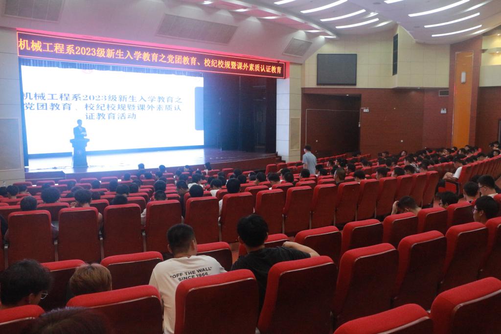 为教育引导广大新生坚定理想信念,树立远大目标,尽快适应大学生活,加强党团教育认知,明确学习目标,西安交通大学城市学院机械工程系于9月7日下午在教二报告厅举行2023级新生入学教育之党团教育、校纪校规暨课外素质认证教育活动。机械工程系主任助理王丽丽、团学工作负责人高荣、20级辅导员史晓薇、21级辅导员张哲源、23级辅导员童治杰及机械工程系2023级全体新生参加此次大会。本次会议由张杰主持。