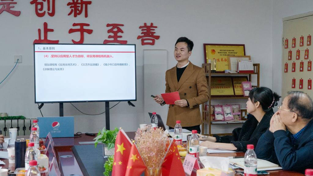 为进一步优化专业人才培养,提高办学水平和办学质量,11月21日,西安交通大学城市学院传播系于活动中心西301召开2024版本科人才培养方案论证会。本次论证会邀请陕西高等学校设置与教学指导委员会人文与新闻传播类工作委员会委员、西安工业大学文学院新闻传播系主任刘磊教授,齐越教育研究中心主任、原西北大学新闻传播学院传播系主任周东华教授,陕西广电融媒体集团(陕西广播电视台)西安咸阳工作站站长、高级记者兰金龙,学院教学服务中心副主任杨宏霞副教授,学院督导组专家张如良教授,传播系主任李明德教授担任专家评委,刘磊教授任担任本次论证会组长。传播系副主任吴越,主任助理、网媒专业负责人马岚,播音专业负责人高宇以及传播系骨干教师参加了论证会。