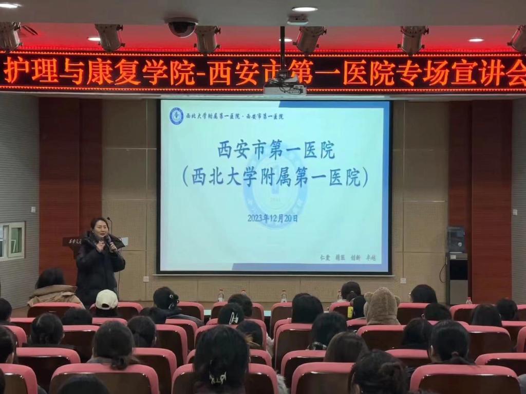 为扩宽毕业生就业渠道,把握优质就业资源,进一步推动和提升学生就业质量。护理与康复学院于12月21日举办了西安市第一医院专场宣讲会,出席活动的嘉宾为西安市第一医院护理部主任任燕萍、副主任张蕾,护理与康复学院院长助理李楠、学生工作负责人王娇丹以及22级护理专升本毕业班同学参与此次活动。