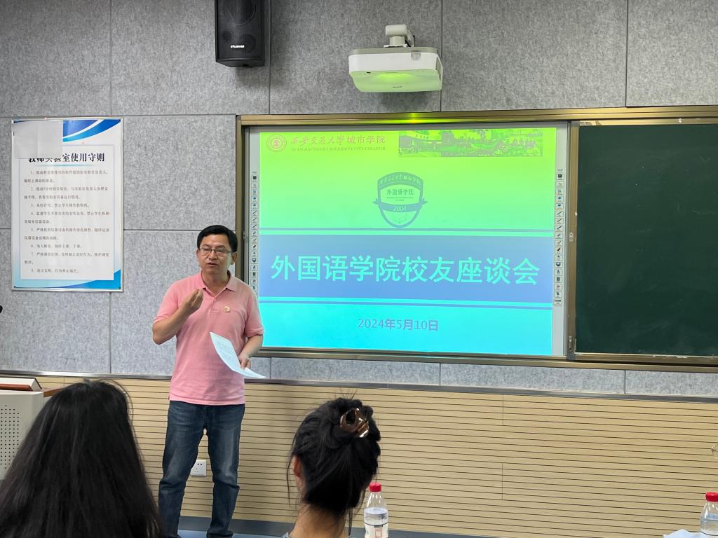 郭继荣院长总结讲话。他对各位校友的到来表示热烈的欢迎和衷心的感谢,他指出,校友是学校建设发展可依靠的力量和宝贵的资源。近年来学院高度重视校友工作,关心和重视校友的成长和发展,外国语学院将一如既往地为校友提供支持,共创互惠共赢的发展新格局。同时,他希望校友们能够继续关注和支持学院的发展,在校企合作、人才培养和毕业生就业等方面给予更多地关心和支持。最后,他对在校生提出殷切期望,勉励他们博览群书,厚积薄发,做有梦想、够自律、有动力的人,以优秀校友为榜样,立足岗位,用自己的青春、奋斗和成就,为社会做出了更大的贡献。