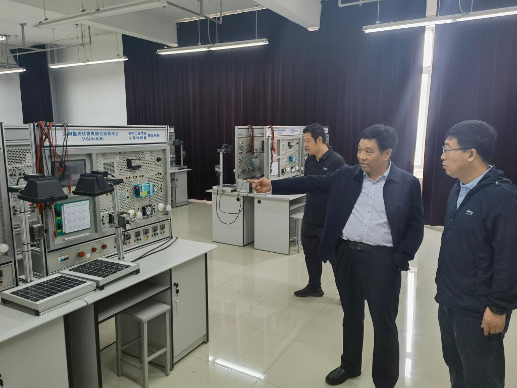 竹有章和赵云芳参观了徐州工程学院物理与新能源学院专业基础实验室、发电系统及应用实验室、新能源系统研发实验室、屋顶电站、太阳能车棚等实验室。参观过程中,教育部新能源科学与工程教学指导委员会委员、徐州工程学院物理与新能源学院滕道祥教授介绍了新能源科学与工程专业创建和发展的历程、实验室建设初衷与特色。参观过程中,滕道祥教授和实验室老师解答了关于实验项目设置和实施方面的相关问题。