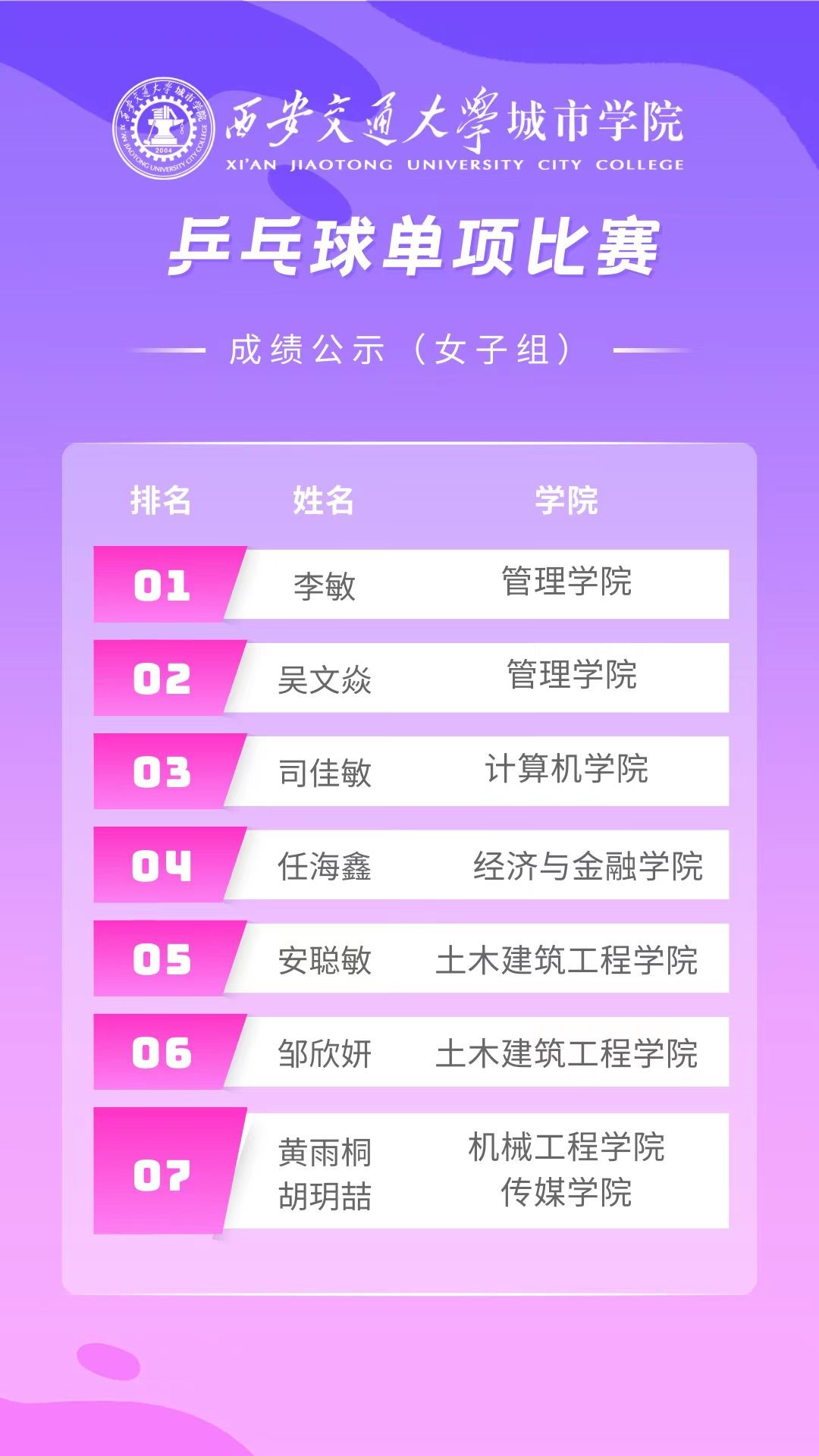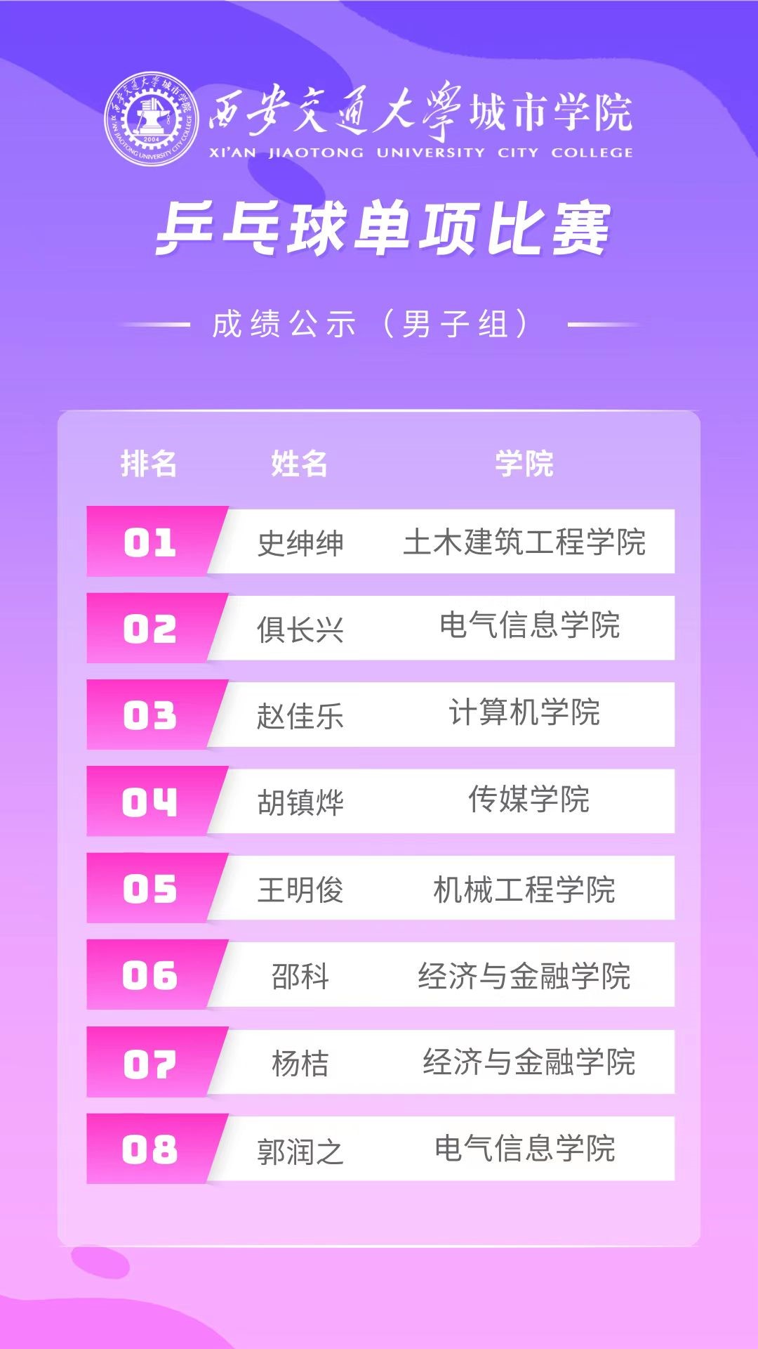 经过激烈角逐,最终成绩尘埃落定。此次乒乓球比赛充分体现了学生积极向上的良好风貌和充满活力的青春色彩。