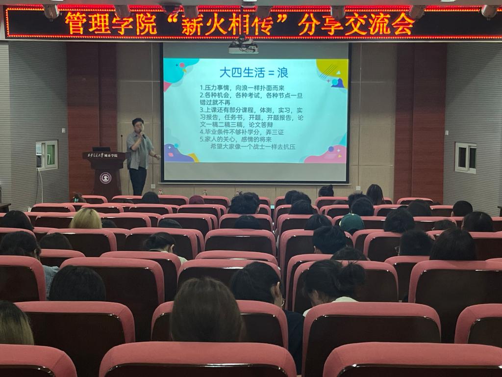 为帮助即将进入大四的同学们明确未来的职业发展方向,为其提供针对性地指导和建议。管理学院于6月6日晚在F100举办“薪火相传”交流分享会。参加本次会议的人员有管理学院团工委书记柯智航、优秀学生代表及2021级学生代表。