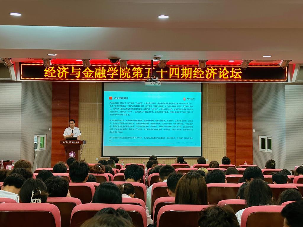 为了增强学生对经济安全方面的意识和对金融行业的了解,经济与金融学院于6月6日在教学楼F100举办了第五十四期经济论坛,本次活动的嘉宾有光大证券西安兴庆路营业部董事副总经理邵博、业务服务部经理朱军华、营业部财富团队长赵珊,营业部财富顾问汤正宇,营业部财富顾问马小琴。经济与金融学院院长助理廉宇婷,团工委书记蒋美一帆,财政专业教师冯茜、高旭、甘萍萍、赵晶、雷蕾出席。本次活动由李嘉怡同学主持。