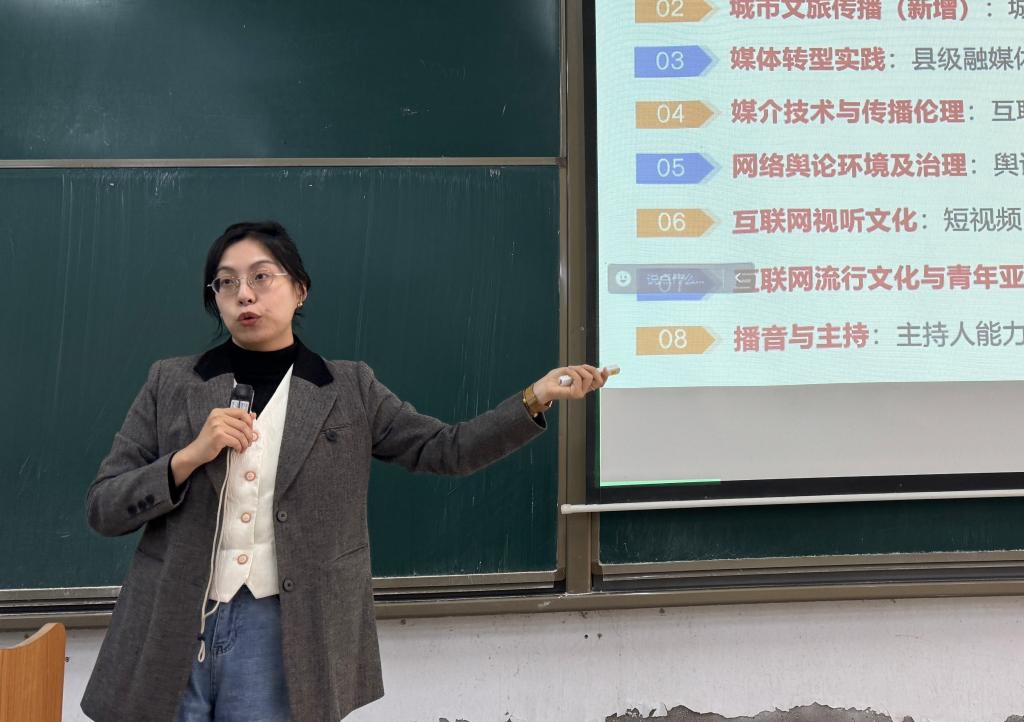 随后,网媒专业教师郭晨雪对毕业论文选题进行了深入讲解。郭晨雪精心汇总并分析了传媒学院2022届至2024届学生毕业论文选题情况,通过直观的图表形式,清晰勾勒出近三年传媒学院毕业论文选题类型分布。她对2025届本科毕业论文选题新变化进行了强调,对选题不当情况进行了逐条提示,并对选题方向提出中肯建议,为2025届毕业生论文选题拓宽了思路。
