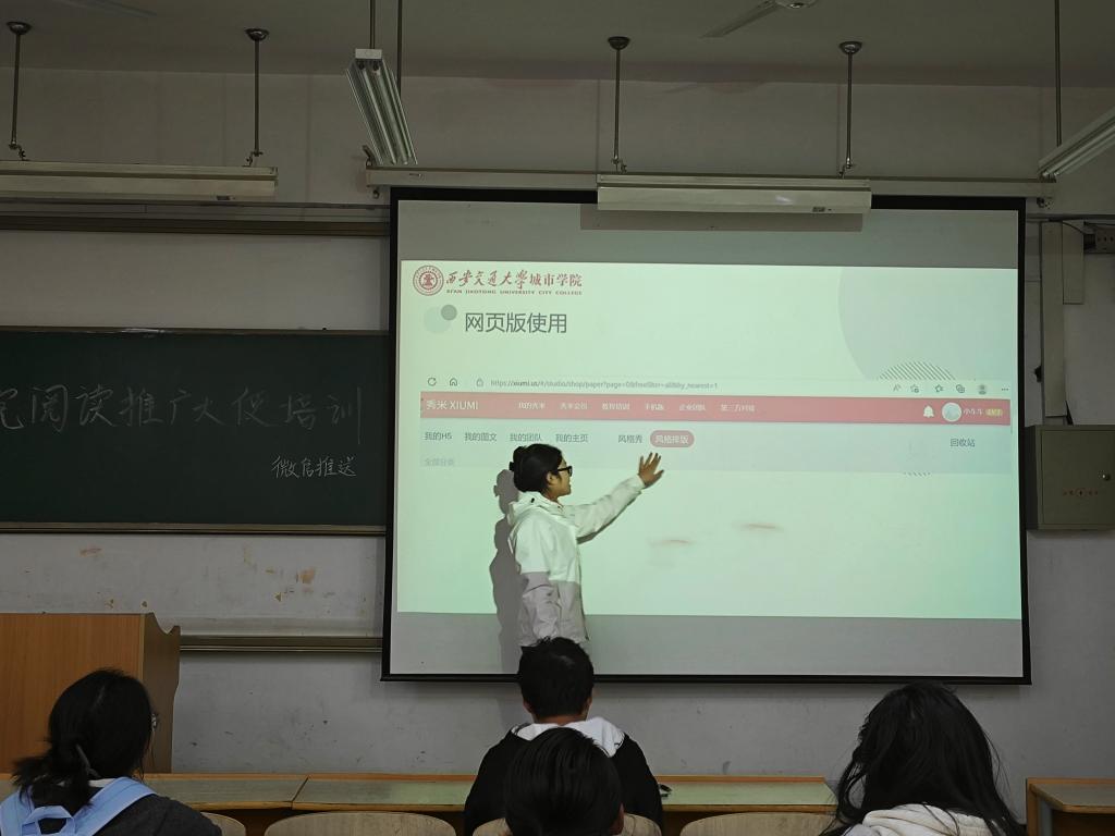 10月31日,微信推送培训在D107教室如期举行。杨馨怡与王梓坤担任主讲人,不仅介绍了“秀米”软件的应用,还深入讲解了推送内容的框架结构、排版设计、图文布局及注意事项等,为阅读推广大使提供了宝贵的宣传与推广经验。