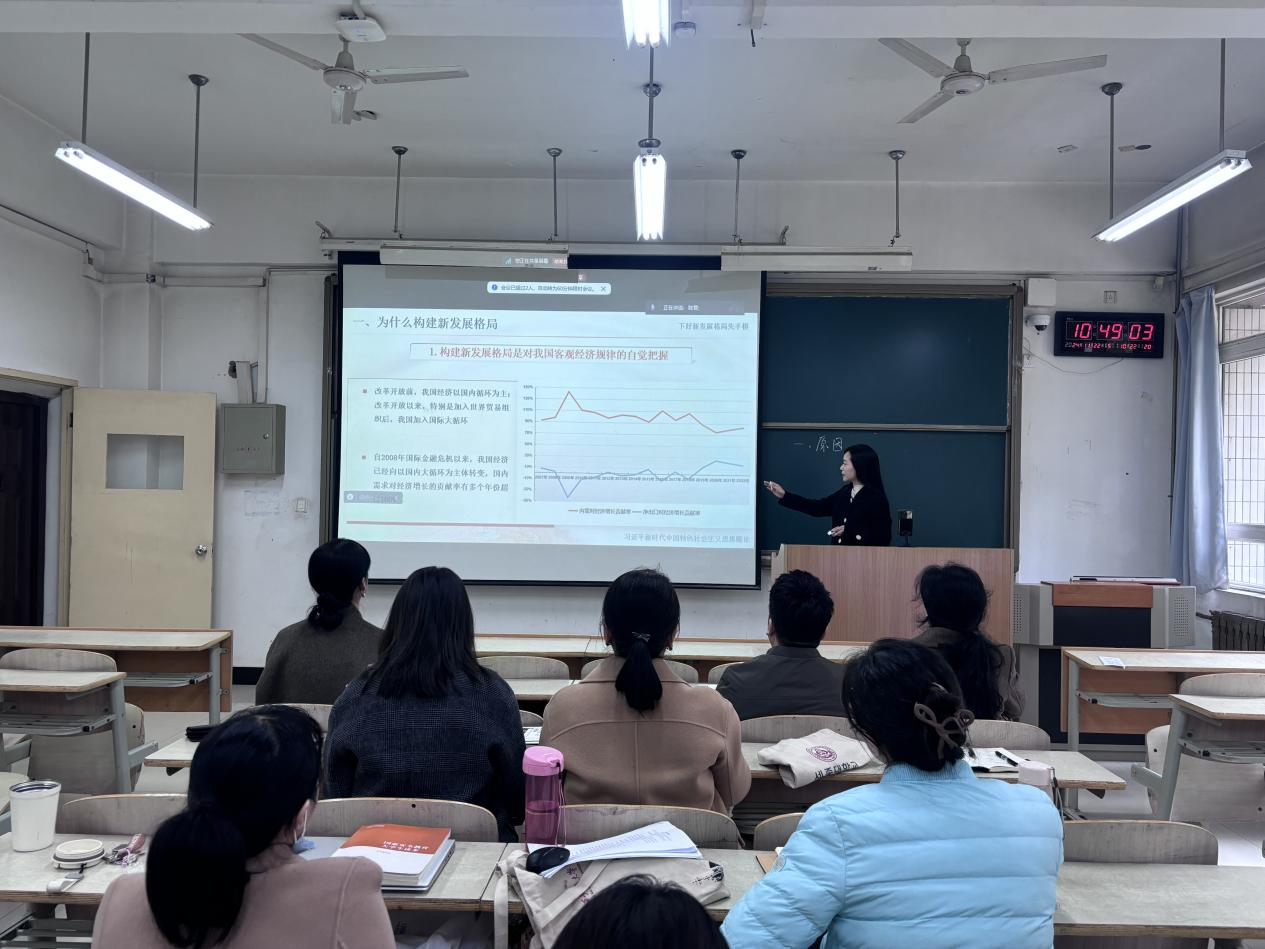 本次教学展示活动由《习近平新时代中国特色社会主义思想概论》课程组杨昭进行授课展示。杨昭围绕授课主题“下好新发展格局先手棋”,从内部和外部两方面生动讲述了构建新发展格局的重要性与必要性,重点讲授了新发展格局的内容,并围绕新发展格局与高质量发展的内在关联深入讲解下好新发展格局先手棋对于推动整体社会经济实现高质量发展所具有的决定性意义与关键战略价值。