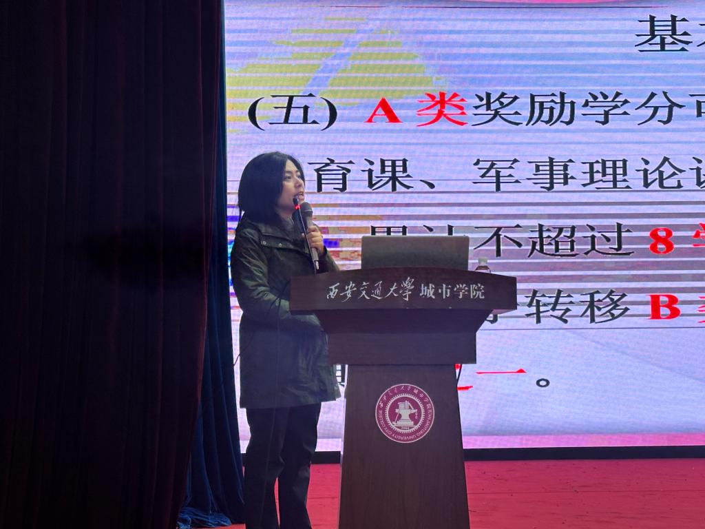 活动伊始,王姣对此次会议的重要性进行了说明。她表示,通过了解毕业要求,学生可以更加明确地规划自己的职业发展方向和升学目标,从而有针对性地提升自己的综合素质和竞争力。随后,刘晓明副院长根据学院下发的《西安交通大学城市学院学分转移与课程替换实施细则》文件,从毕业要求、学分修读等方面为学生做了详细讲解。她指出,学生应在最后的学习阶段明确目标,充分利用校内外资源,扎实完成毕业前的各项任务。她强调了毕业设计与实习的重要性,鼓励学生以认真的态度对待学术研究和职业实践,并以往届优秀毕业生为例,分享了成功经验,激励同学们不断提升自身综合能力。刘晓明副院长还提醒学生要提前关注毕业审核相关流程及时间节点,积极与导师沟通,确保顺利毕业。此外,她对学生存在的疑问进行现场解答并为毕业生提供了切实可行的建议。