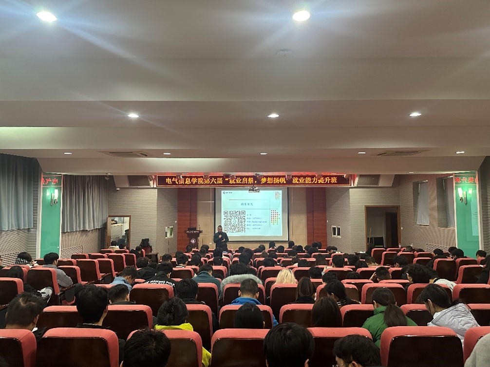11月28日上午,电气信息学院第六届就业能力提升班第四讲在F100报告厅举行。本次活动由电气信息学院学生工作负责人王姣主持,特邀两家知名企业——长河通信企业和陕西嘉天云科通信科技有限责任公司代表作专题讲座。