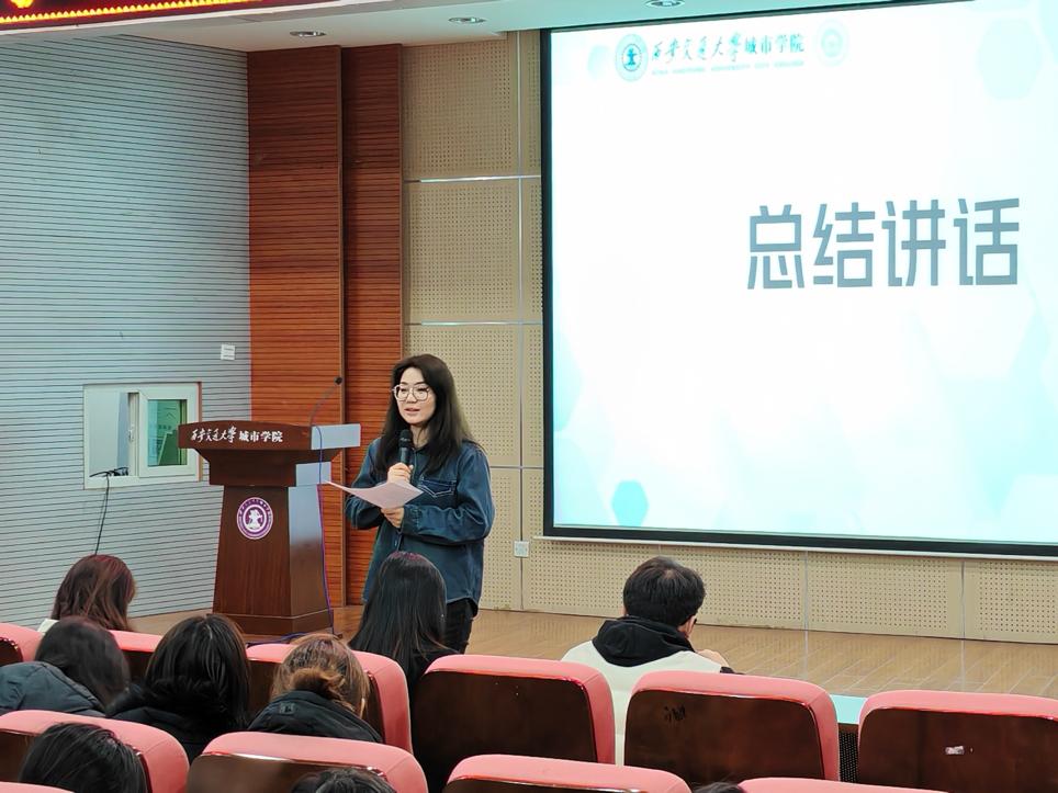 王丽丽进行总结发言。王老师表示,规划是人生梦想的蓝图,希望各位同学都能有所收获,有所思考。同时希望这次的活动能带给大家力量不断前进,用奋斗渲染青春时光,不负韶华,为实现中华民族的伟大复兴贡献出自己的力量。