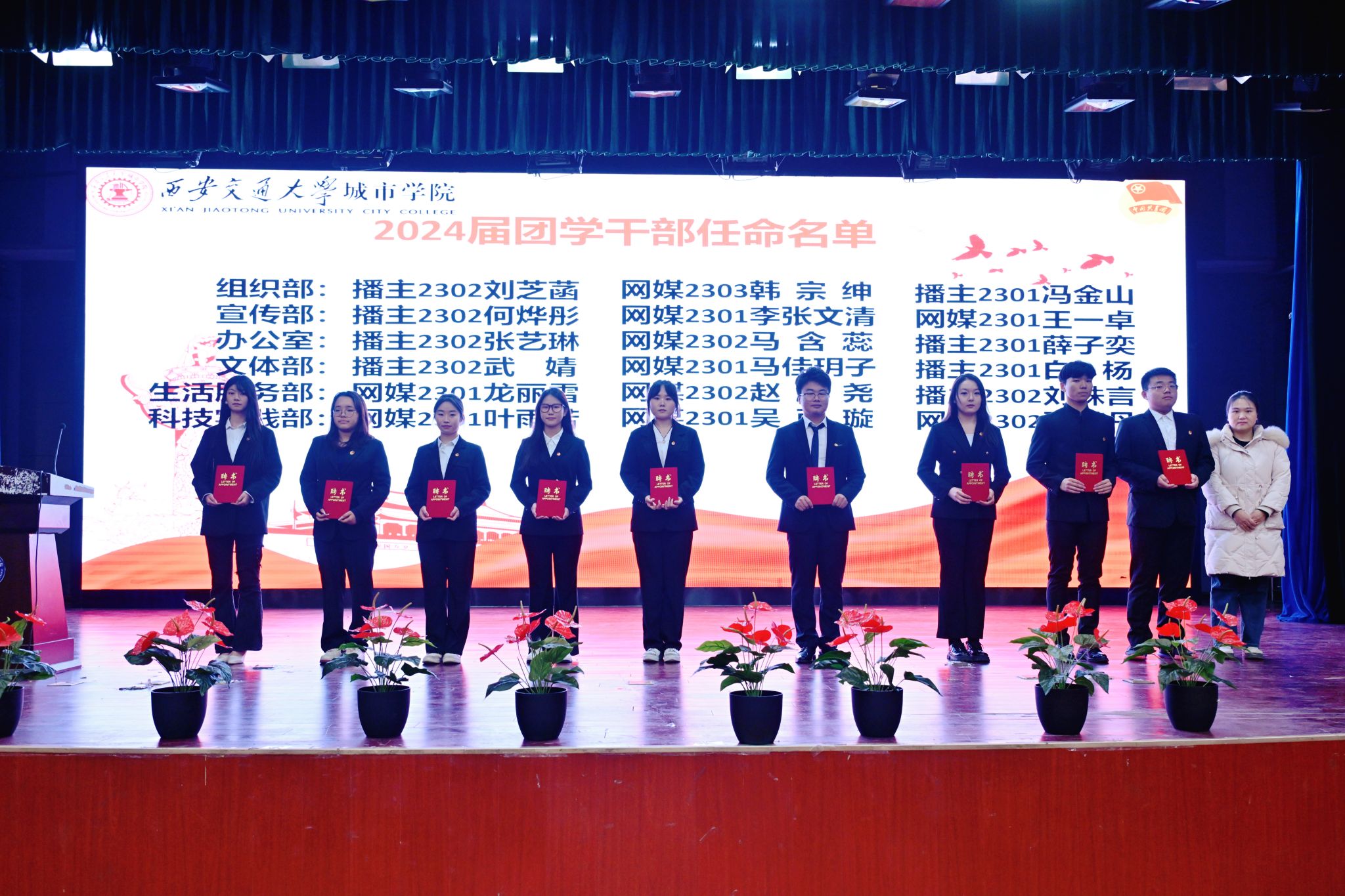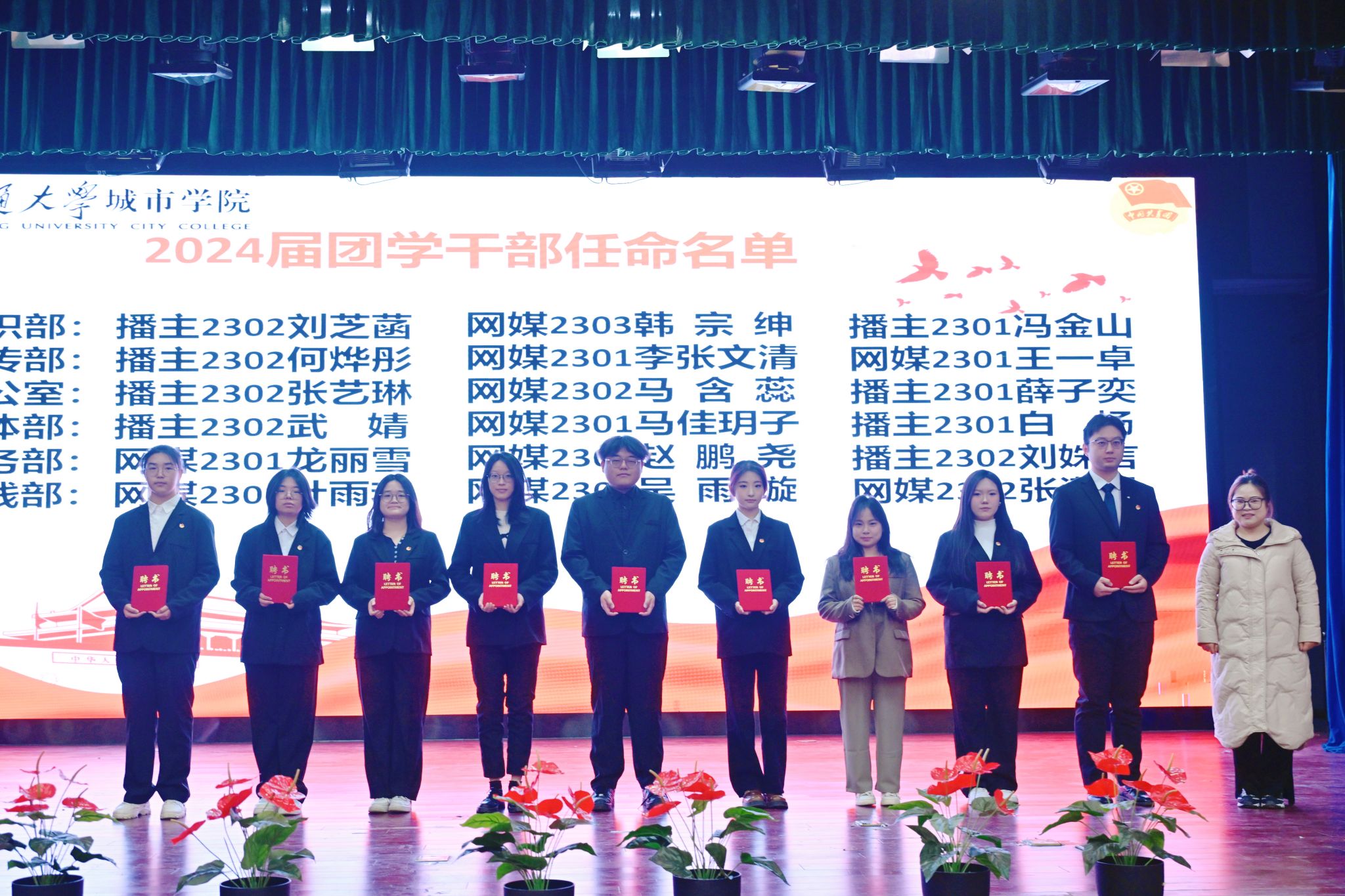活动伊始,全体奏唱团歌。周林欣宣读2023年“五四评优”优秀团学干部名单和优秀共青团员名单,2023届优秀团学干部代表和新一届团学干部进行发言。随后,团工委书记陈欣宣读2024级团学干部任命名单并为新任团学干部颁发聘书。团工委副书记朱致成进行2024年团学工作总结汇报、学生会执行主席王钰洁进行2025年团学工作计划汇报。