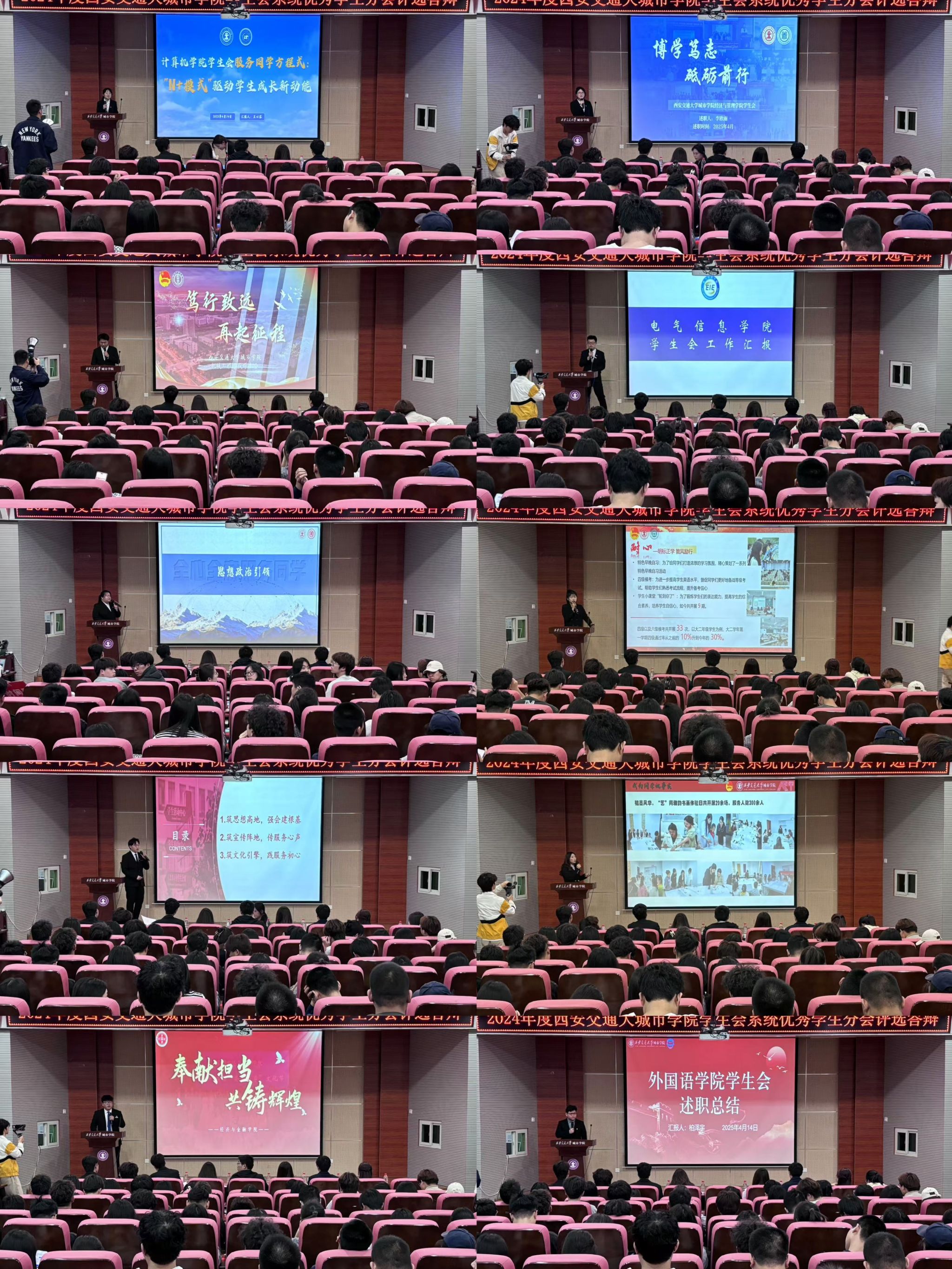 4月14日中午,西安交通大学城市学院学生会于F100报告厅成功举办2024年度优秀学生分会评选答辩活动。本次活动旨在强化学生会组织效能,激发基层活力,通过成果展示与经验交流,表彰先进、树立典范,进一步推动校园文化建设和学生服务工作。邀请多校学生会代表组成评审团,包括西安交通大学学生会主席团成员兰思达、西北大学学生会执行主席陶诗雅、西安建筑科技大学学生会主席团成员王培钦、西安工业大学学生会主席团成员黑亚楠、陕西理工大学学生会执行主席黄超。西安医学院学生会主席团成员赵泽远、陕西理工大学学生会办公室负责人黄经纬、西安交通大学城市学院团委高荣、校学生会主席团成员、第七届学生会委员会委员、各二级学院主席团成员及学生代表出席本次活动。本次会议由张挺同学主持。