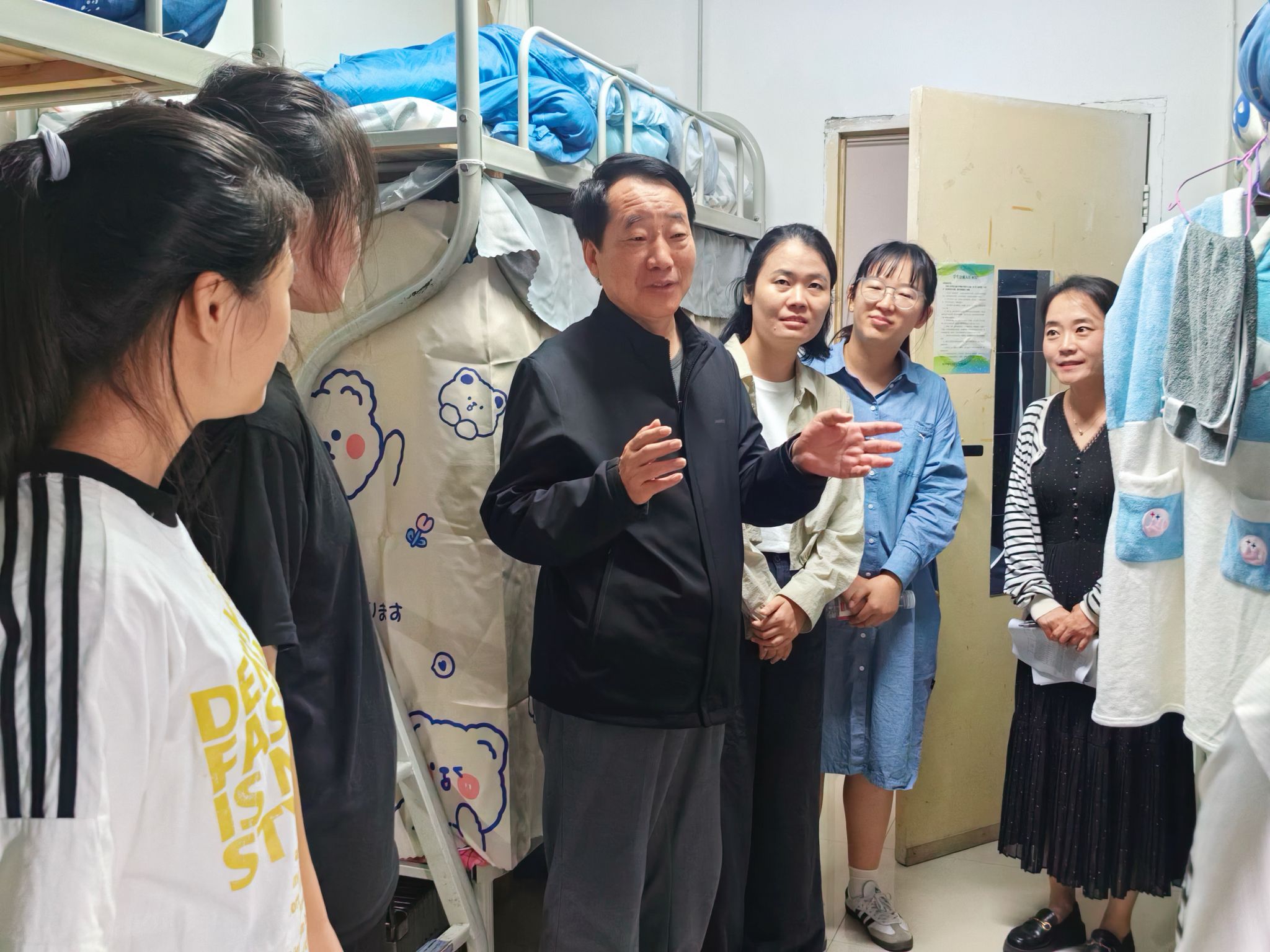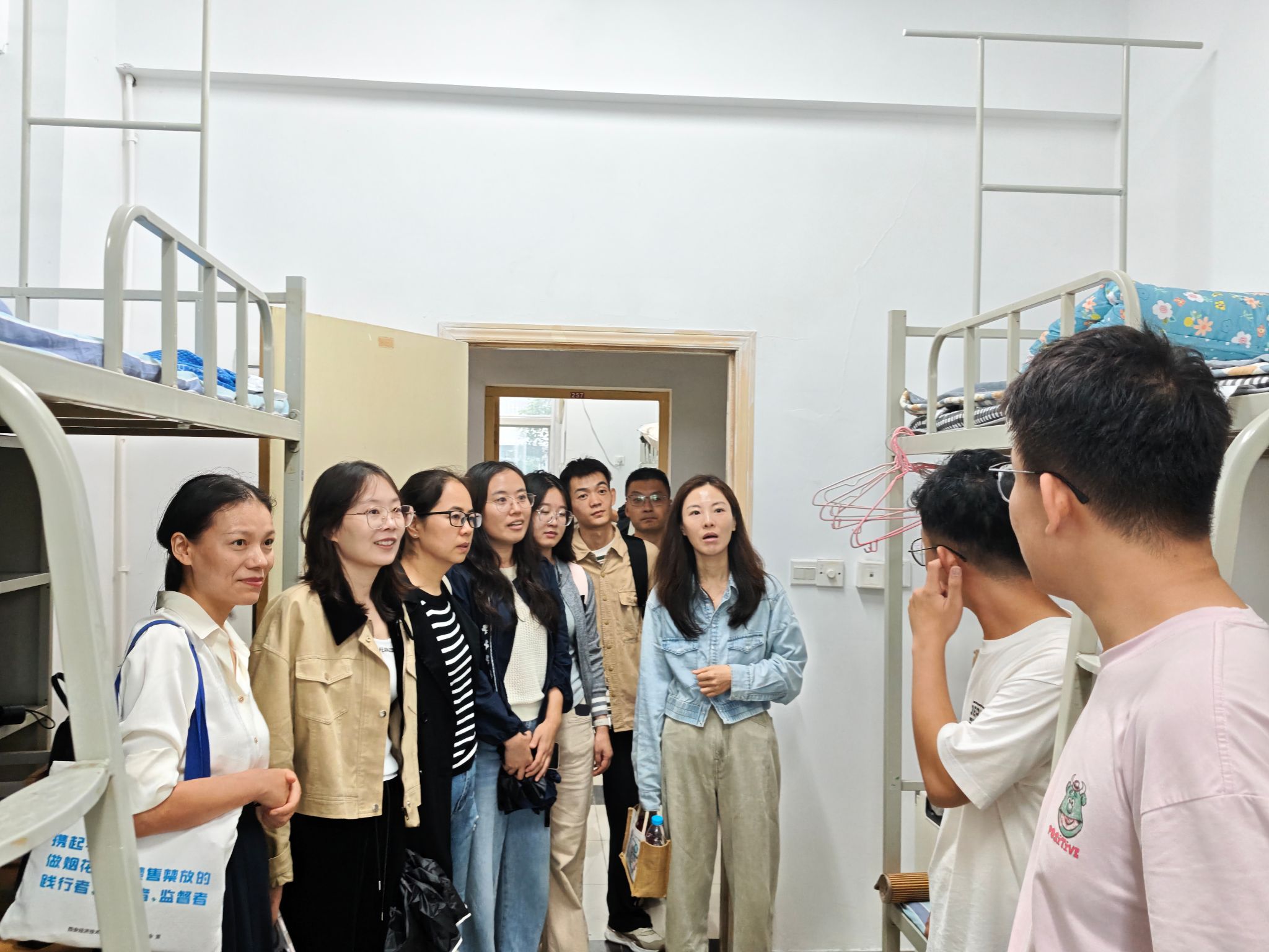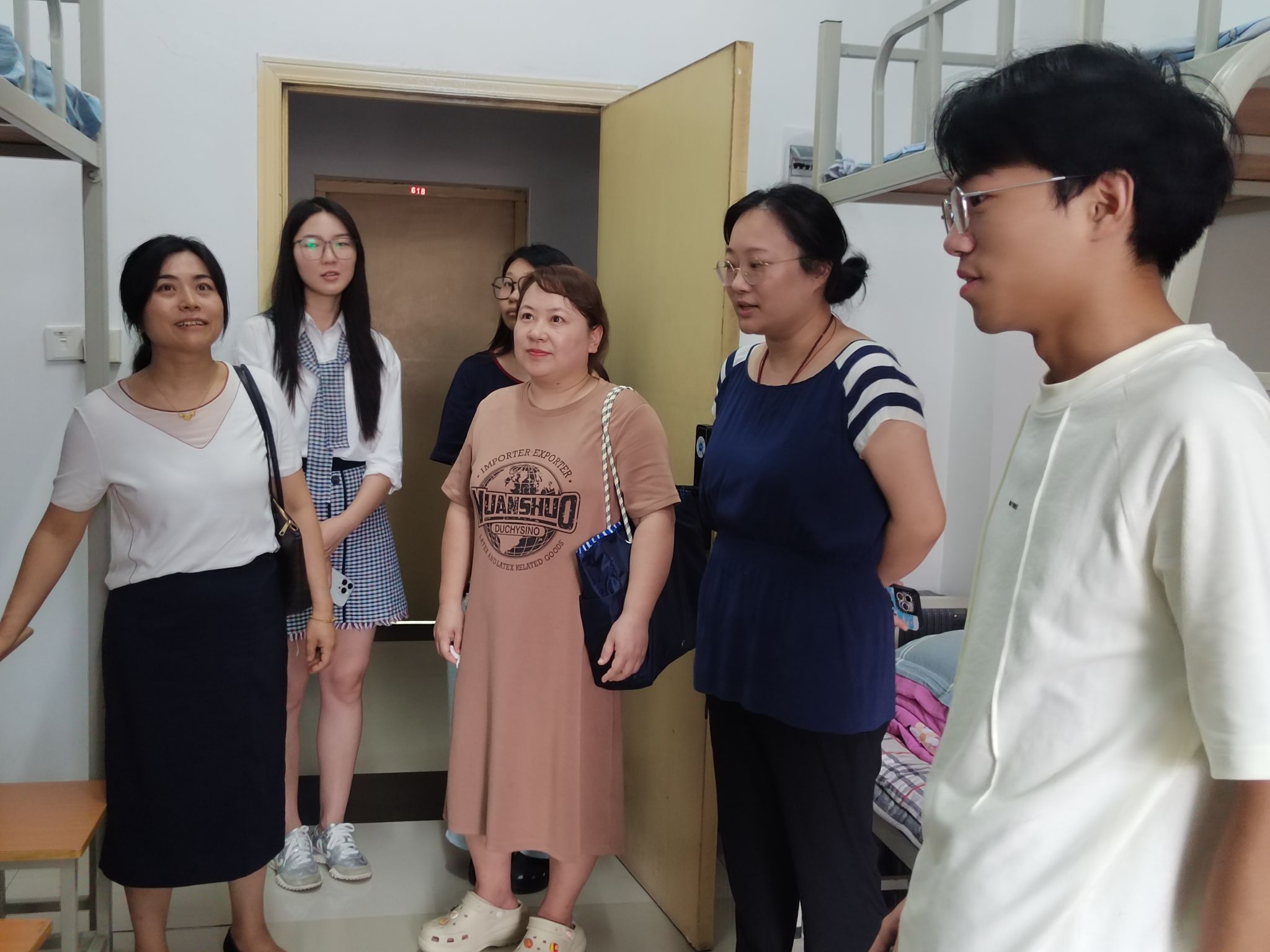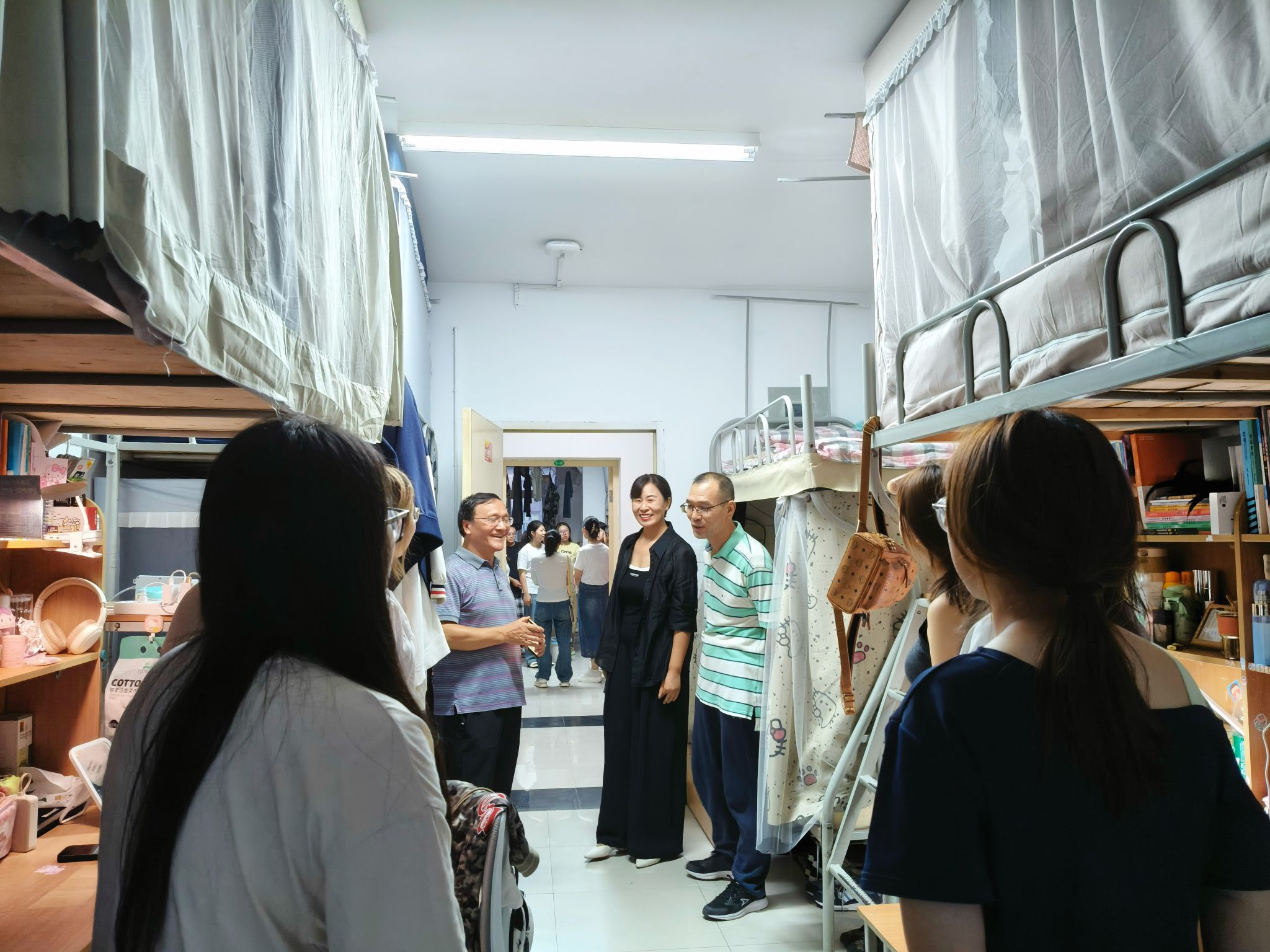 8月24日下午,学院组织开展新生宿舍走访。姚全珠院长、教师及新生辅导员一行深入新生寝室,问候新同学,了解入住情况与实际需求。老师们嘱咐大家注意身心健康,学会压力管理,并细致检查宿舍安全与卫生,提醒遵守住宿规定,鼓励同学之间团结友爱,共同营造良好的学习和生活氛围。