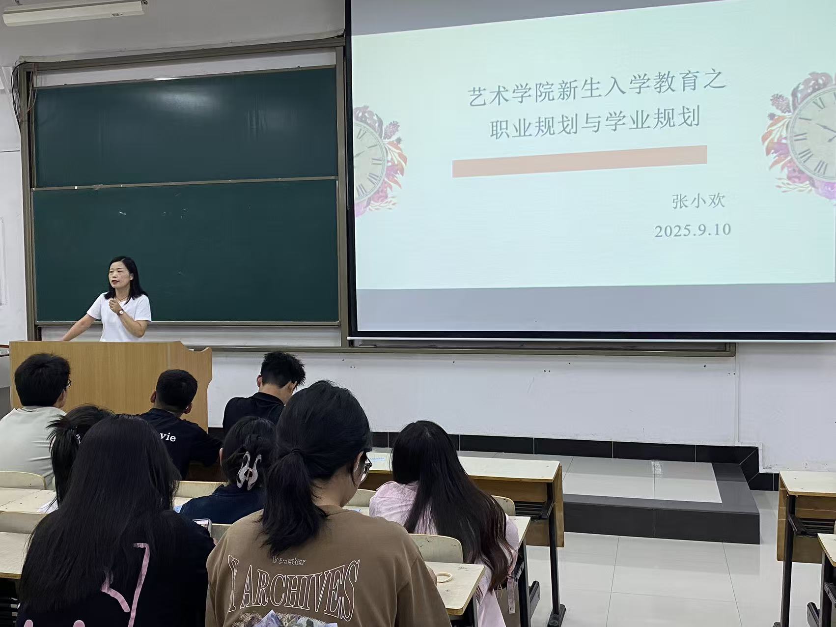 ——专业认知篇。为让新生更好更快地了解所学专业,9月9日晚,艺术学院在F100教室开展专业认知教育。院长助理吴兹古力向2025级新生介绍了学院的师资力量,专业建设,教学规划、实践活动等,让新生对所学专业有了更进一步的认识和理解。其次,院长解安宁教授对2025级新生表示由衷地欢迎,并对专业的认知、对未来的展望以及对同学们的期望与同学们互动交流,希望2025级学生能够积极投身到专业学习中。随后,由各系系主任带领各专业新生进一步开展专业认知教育,让新生能够更加详细地了解所学专业。最后,由各班班主任对各班级新生开展“开学第一课”主题班会,帮助学生能够更快更好地适应学习生活,制定学习计划。