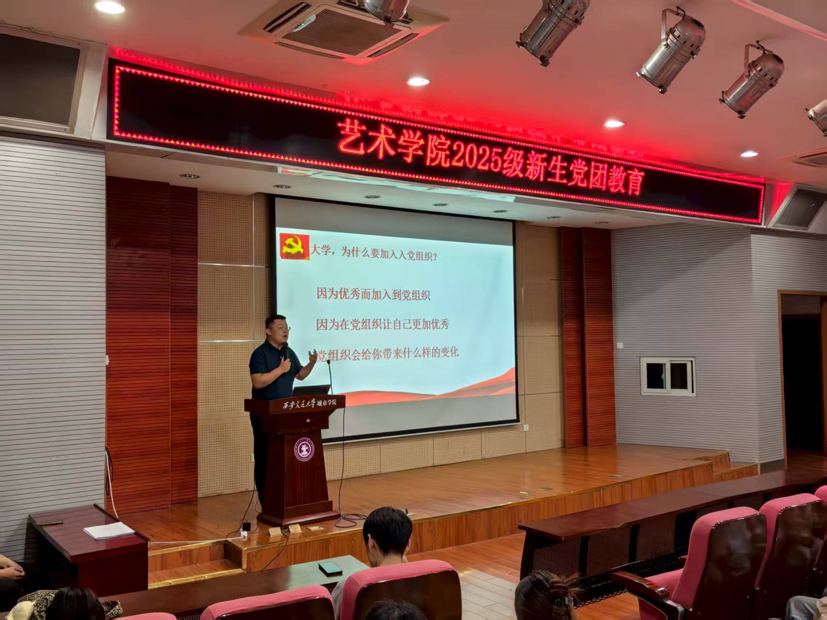 ——党团教育篇。9月11日晚0,艺术学院学生党支部书记李成和团工委书记刘牧原为新生开展党团知识教育讲座,李成从怎样认识党,如何加入党组织,入党流程、如何成为一名合格的共产党员和学生党支部活动开展等方面进行了细致的讲解,并从“态度,习惯,感恩,传承”八字教育理念,号召同学们不仅从思想上入党,更要在行动中入党。刘牧原对艺术学院团工委组织架构、学生会工作职能以及往年优秀团学活动做了详细介绍,刘牧原老师还鼓励同学们在大学中加入团学组织,锻炼自己的能力。