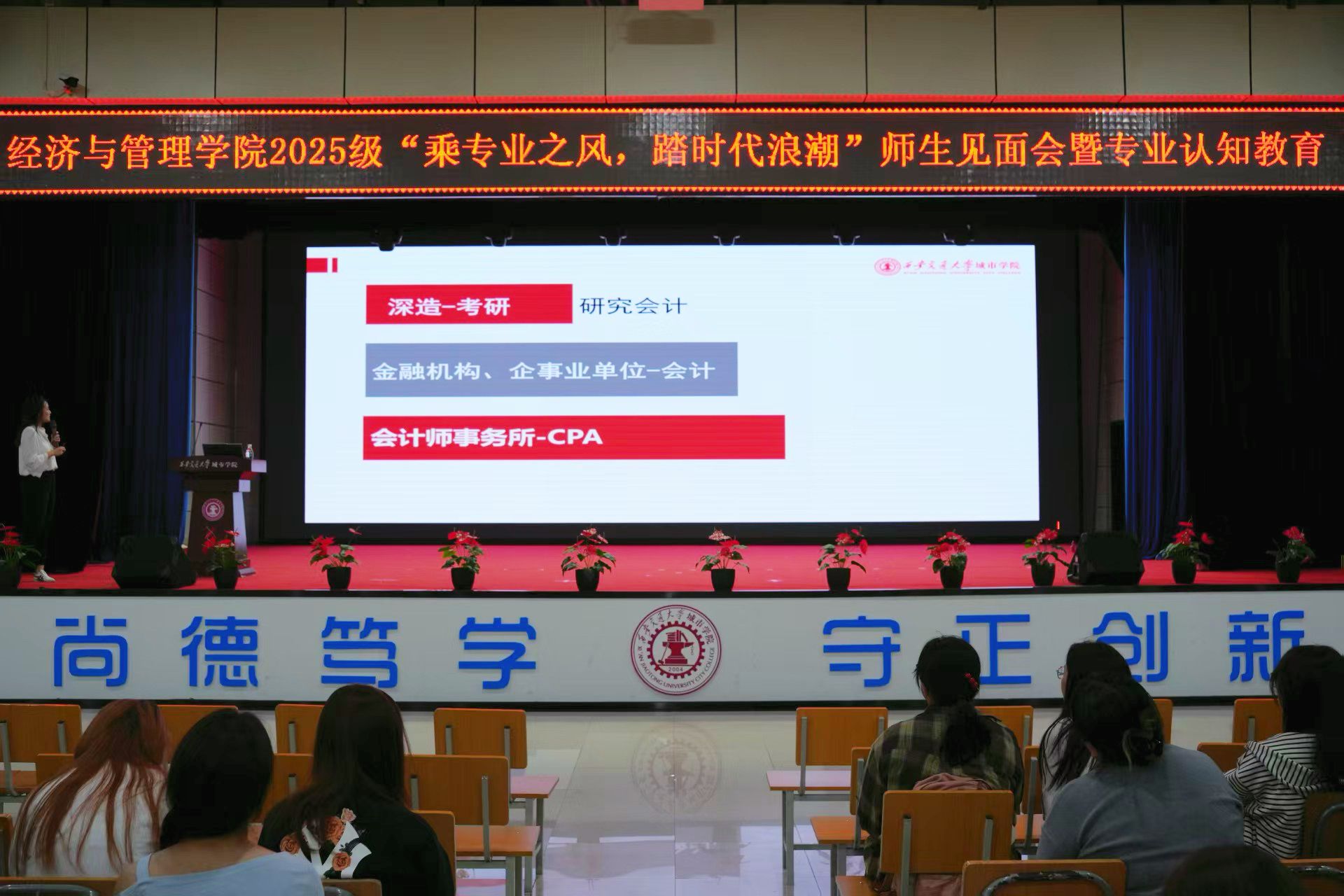 为帮助2025级新生快速融入校园、明晰专业方向、搭建师生沟通桥梁,9月10日晚,经济与管理学院在活动中心举办“乘专业之风,踏时代浪潮”2025级师生见面会暨专业认知教育活动。学院院长张俊瑞教授,副院长王旭副教授、白丹副教授、院长助理屈雯老师,工商管理系主任宋安玲副教授、财政系主任张娜副教授、金融系主任刘萍副教授、会计专业教师郭蓉副教授、工商管理专业教师包子敏老师、全体班主任和辅导员老师及2025级全体新生共同参加本次活动。活动由院长助理刘健主持。