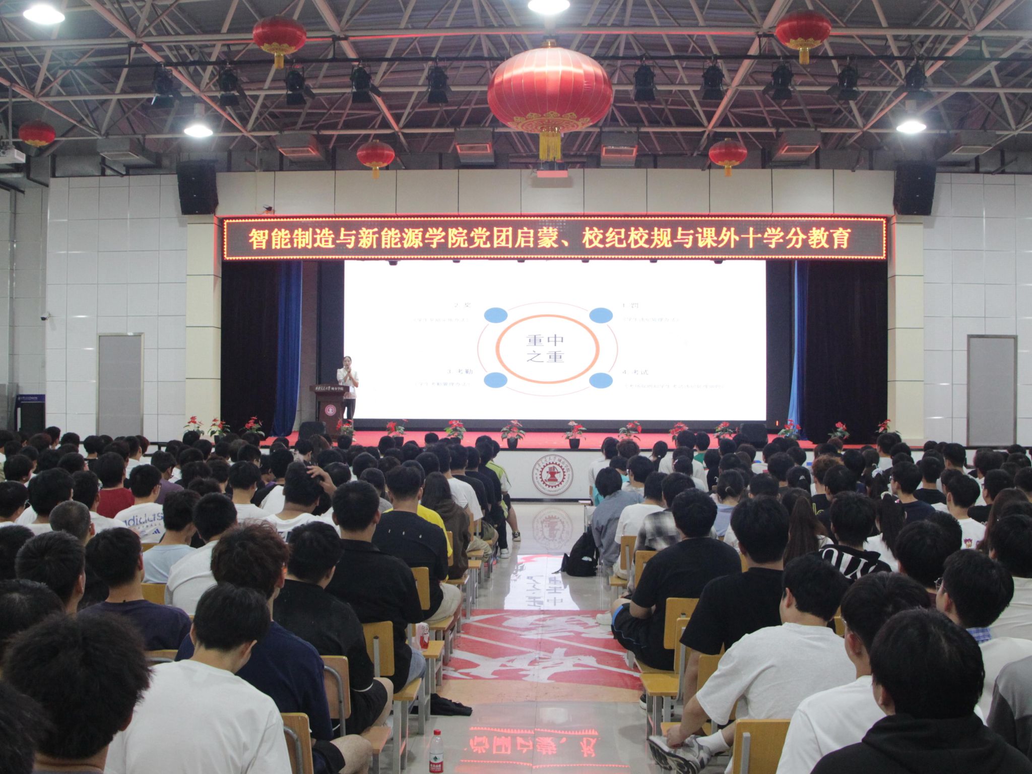 9月16日晚,智能制造与新能源学院召开的2025级新生党团启蒙、校纪校规课外十学分教育大会在大学生活动中心顺利举行。学院副院长竹有章教授,学生党支部书记、学工负责人王丽丽,学生党支部组织委员史晓薇,宣传委员童治杰,学院团工委书记张哲源,2024级辅导员张元婕,2022级辅导员王令出席会议。会议从思想引领、实践指引到行为规范与成长期许,为学生成长提供全方位指引。
