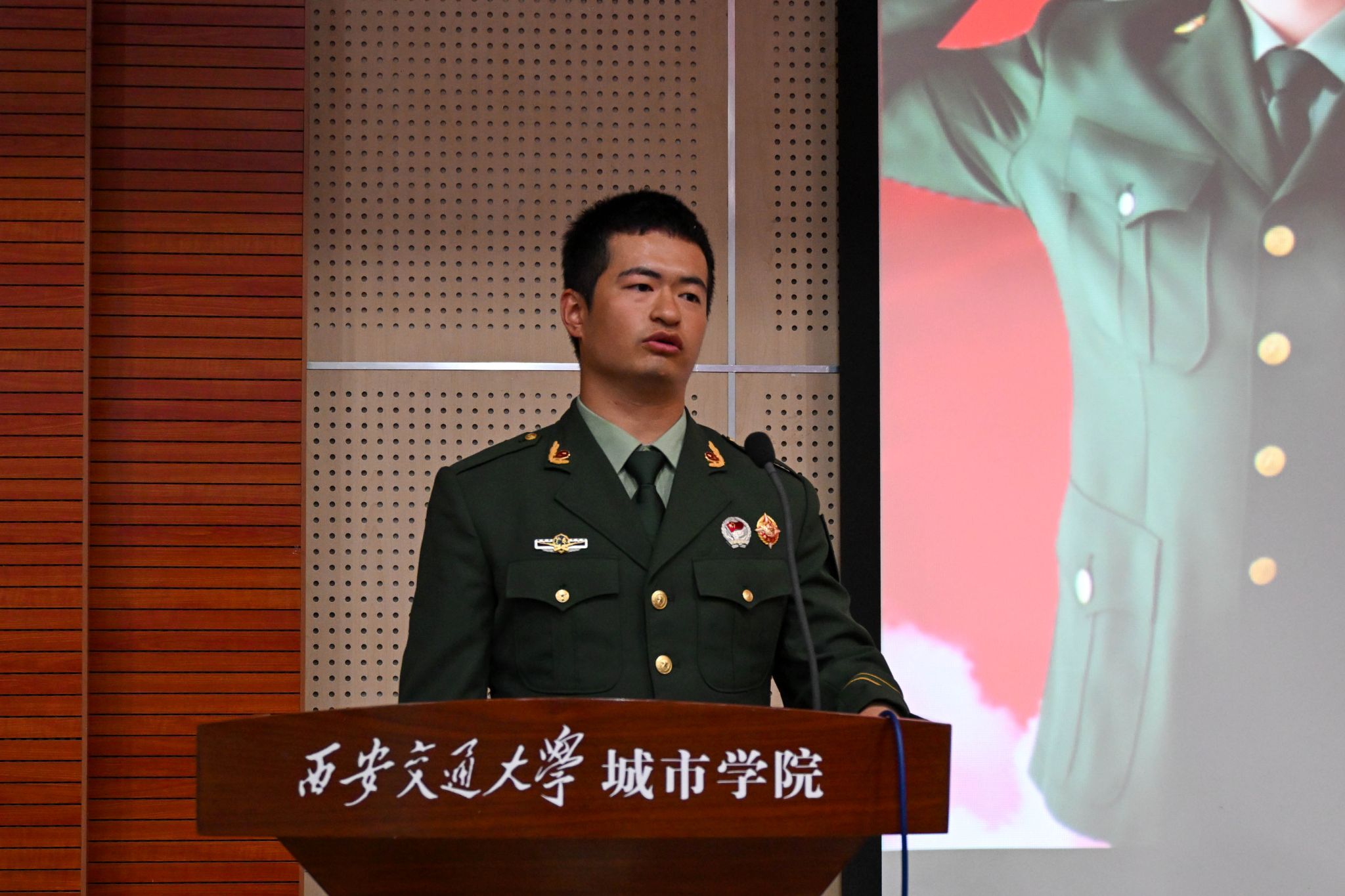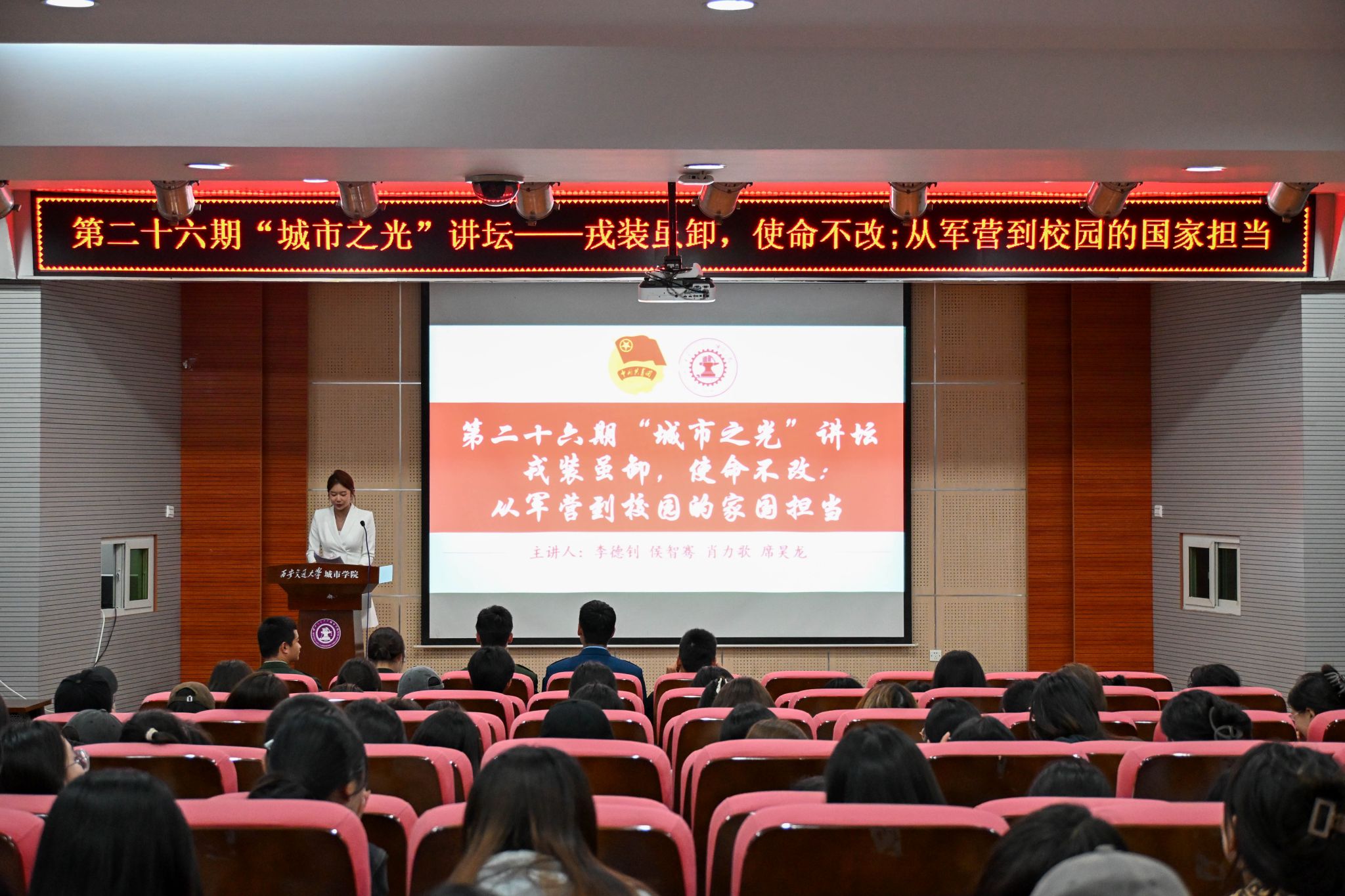9月18日,第二十六期“城市之光”讲坛在F100举行,本次讲坛以"戎装虽卸,使命不改"为主题,通过退役大学生士兵的军旅故事,引导青年学子在历史坐标中锚定青春航向。四位曾服役于解放军和武警部队的优秀代表,用热血与忠诚诠释了"退伍不褪色"的军人本色,为现场师生上了一堂生动的爱国主义教育课。