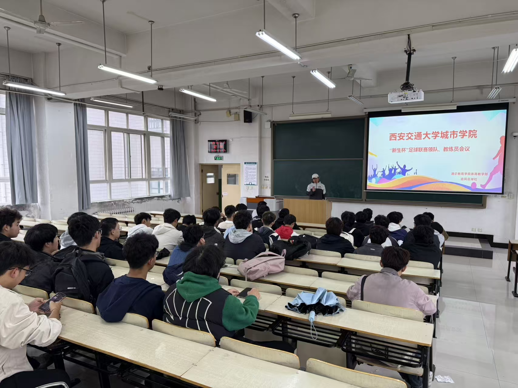 10月17日中午,西安交通大学城市学院“新生杯”足球赛赛前领队、教练员及裁判员培训会议在教学楼B400举行。会议由通识教育学院体育教学部主任助理周帅主持,各参赛队伍领队、教练员及裁判员共同参与。会议旨在明确赛事各项要求,统一执裁标准,严明赛场纪律,保障“新生杯”足球赛安全、有序、公平、精彩地开展。