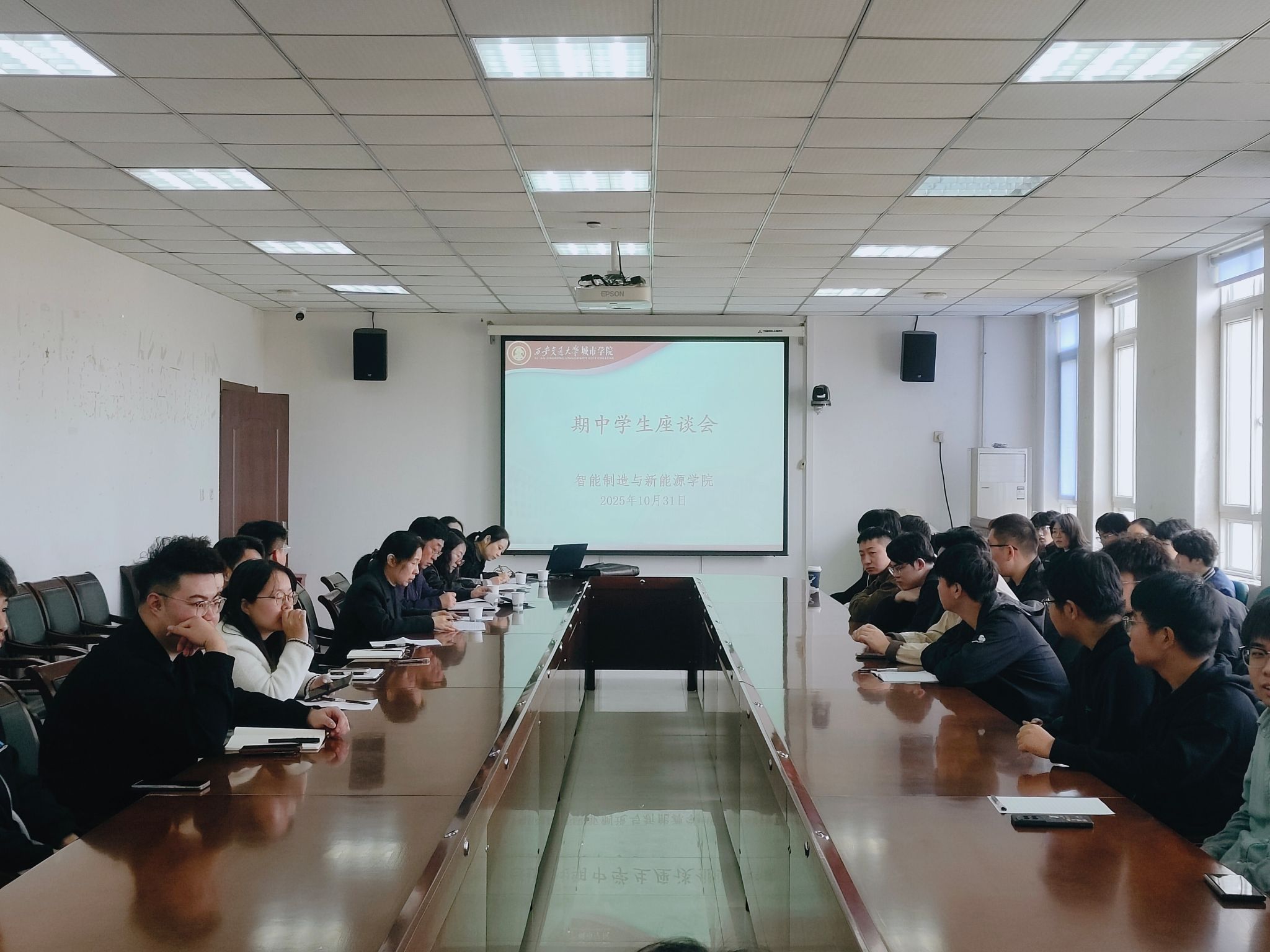 智能制造与新能源学院于10月31日在行政楼504会议室召开期中学生座谈会。学院副院长竹有章、院长助理门静、机械工程及自动化系主任李娜娜、能源与动力工程系主任李莉、全体辅导员及各年级学生代表共50余人参会,围绕课程安排、英语四六级备考等核心问题展开深入交流。本次会议由学院院长助理王丽丽主持。