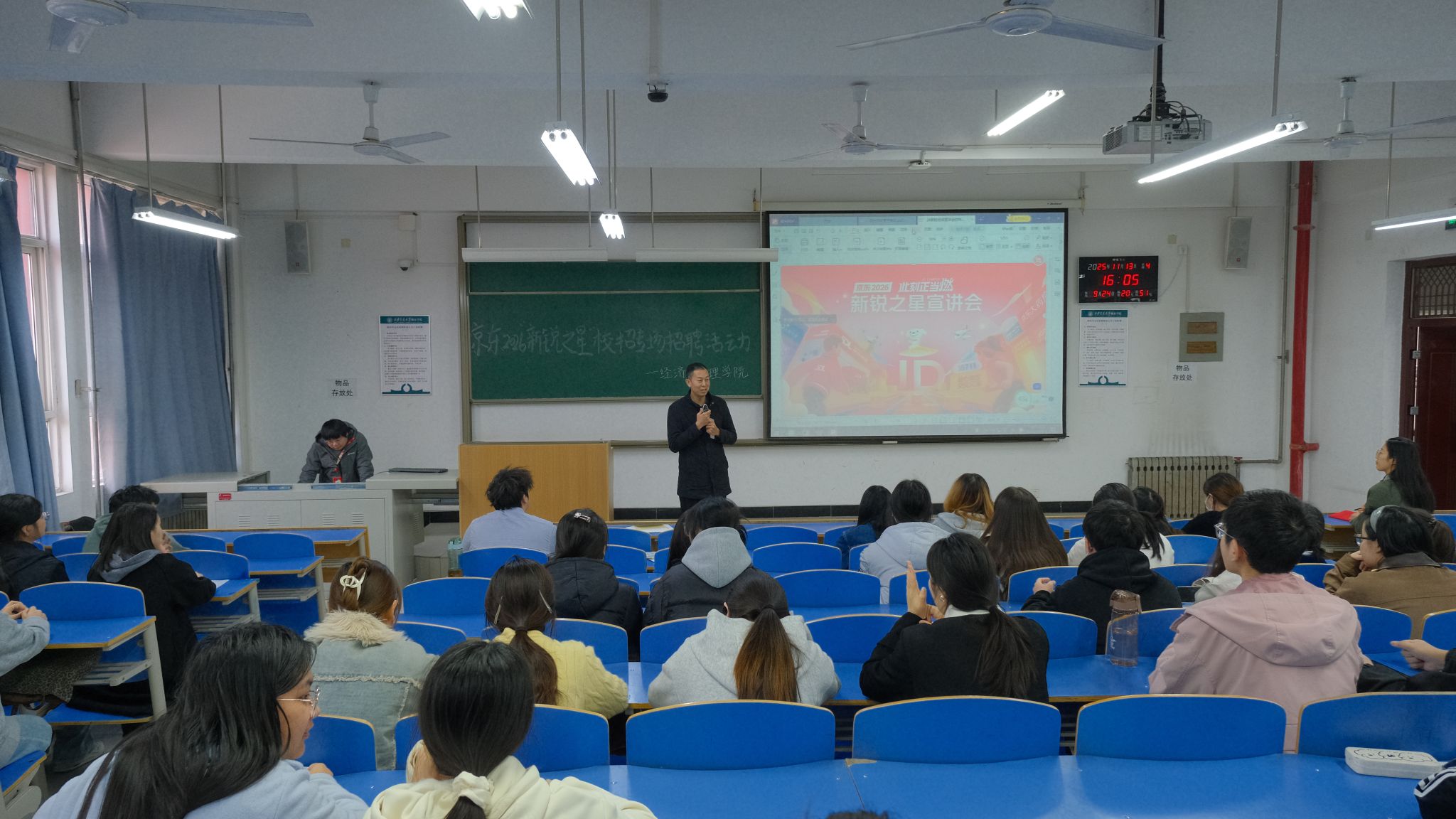 京东集团2026“新锐之星”校招专场宣讲在教二317进行。招聘负责人从企业发展历程、核心业务布局切入,详细介绍了京东的企业文化与行业竞争力,重点解读了京东物流板块的未来发展战略与人才需求规划。针对学子关切的岗位信息,负责人逐一梳理了招聘岗位的职责要求、晋升路径及薪资福利,涵盖运营管理、物流规划、市场拓展等多个热门方向,为大四学生提供了清晰的职业选择指引。