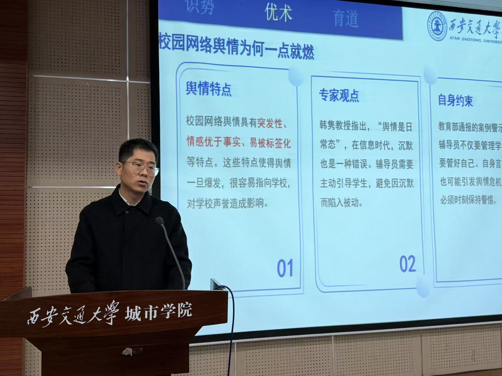 计算机学院心理专员来涛在《立足主体 赋能成长》的分享中,分析了当前学生中常见的三种典型表现,并提出了相应的引导教育策略。他特别强调,在教育过程中要注重激发学生的主体性,通过有效赋能,促进学生自觉、主动地实现个人成长与发展。
