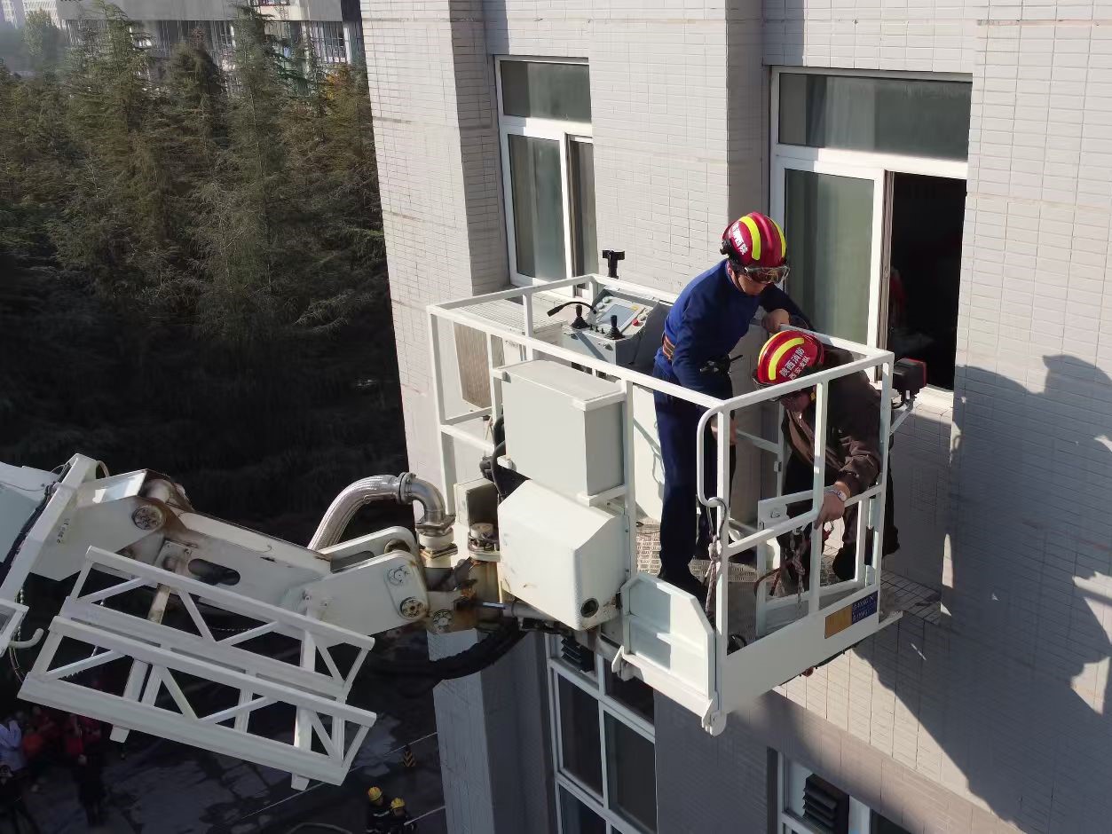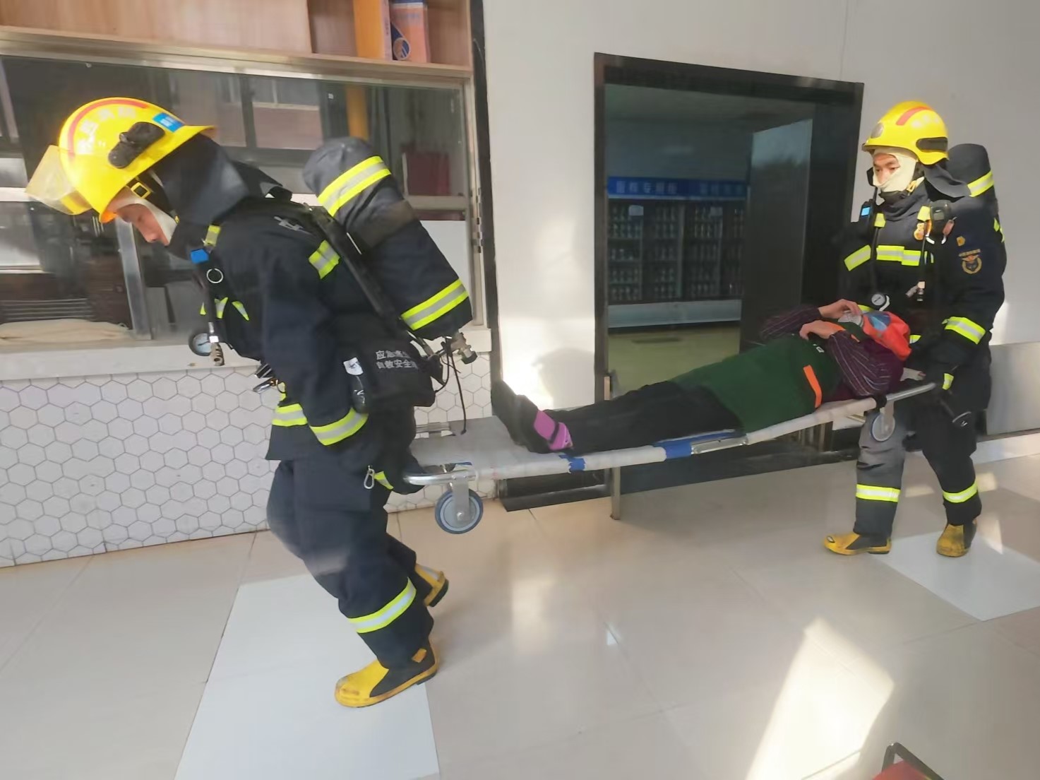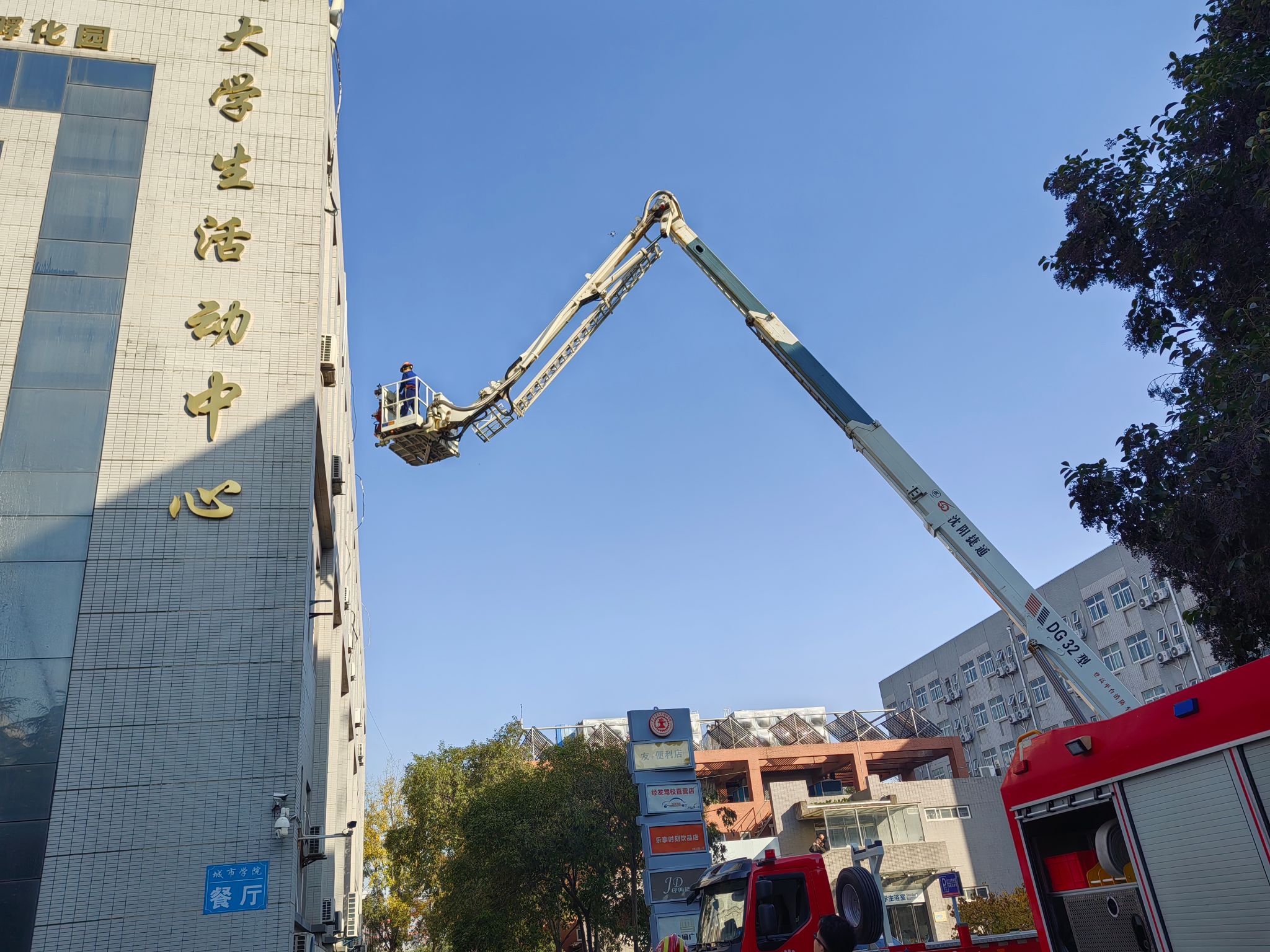 下午3时,应急疏散演练正式拉开帷幕。演练模拟学生食堂操作间突发“火情”,现场顿时浓烟弥漫,消防应急广播随即响起。听到警报后,食堂内工作人员及模拟就餐的学生在引导下,迅速弯腰低姿,沿指定疏散路线紧张有序地撤离至安全区域。食堂经理发现险情后,立即拨打保卫处值班电话报警。校园微型消防站队员接报后迅速响应,第一时间赶赴现场进行初期火情处置,并同步拨打“119”向专业消防力量求助。鸿明路消防救援站接警后火速出动,消防车辆及时抵达现场。消防官兵们动作娴熟,连接水带,强大的水流精准射向“火点”;同时,救援人员冒着浓烟冲入室内,成功营救出被困“伤员”。守候在旁的校医院医护人员立即上前,对“伤员”进行紧急检查与救治。演练过程中,接到报告称三楼团委办公室有人员因“火势”受困,现场指挥立即调度登高平台消防车展开高空救援,顺利将“被困人员”安全转移至地面。整个演练过程紧张有序、配合紧密,达到了预期效果。