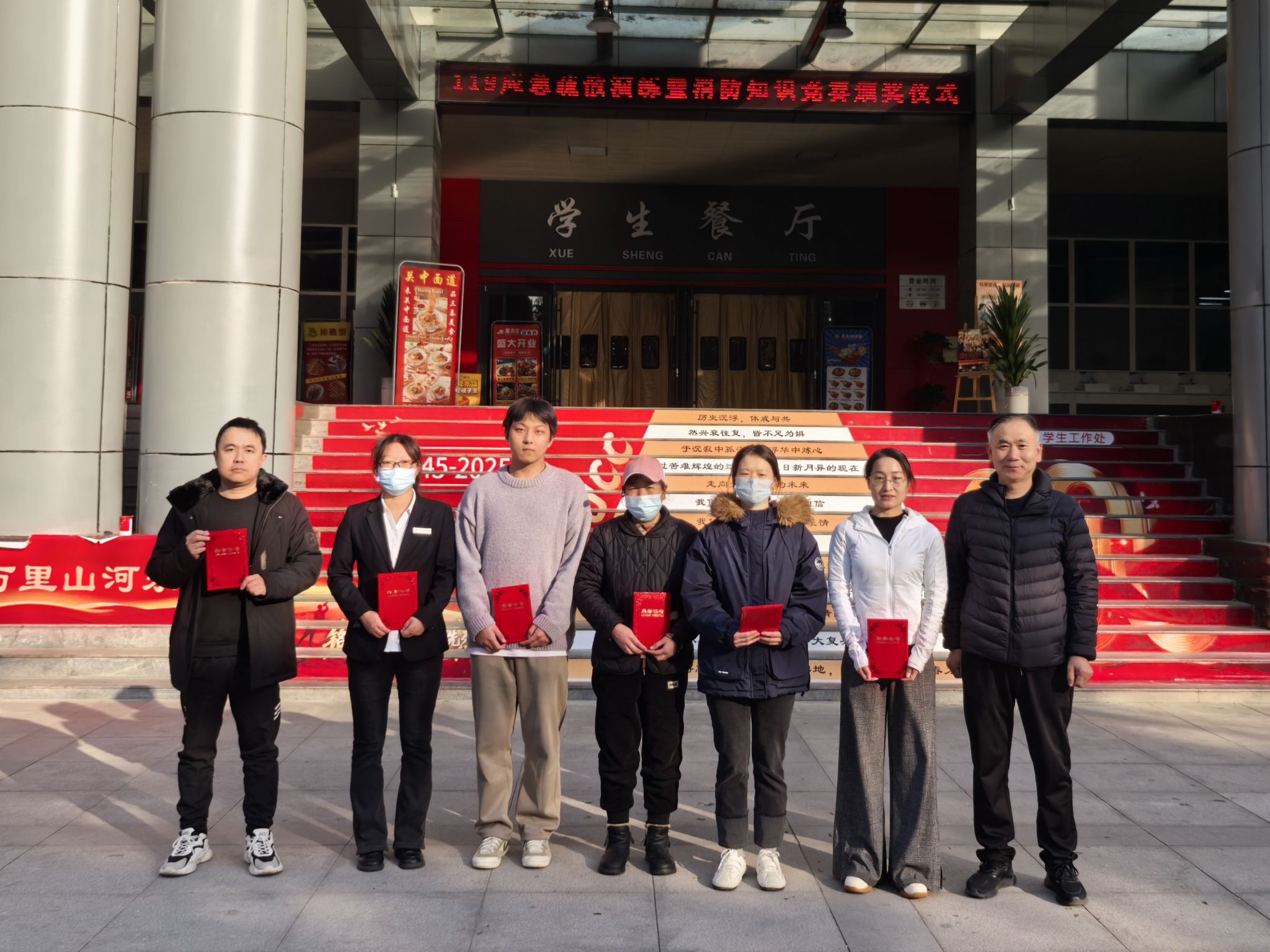 为切实增强师生员工的消防安全意识,提升应急避险和自救互救能力,11月21日下午,我校在学生食堂组织开展2025年“119消防宣传月”应急疏散演练暨首届消防知识竞赛颁奖仪式。副校长岳华海,校长助理、行政人事部部长姬志国,校长助理、财务处处长马江涛参加活动。