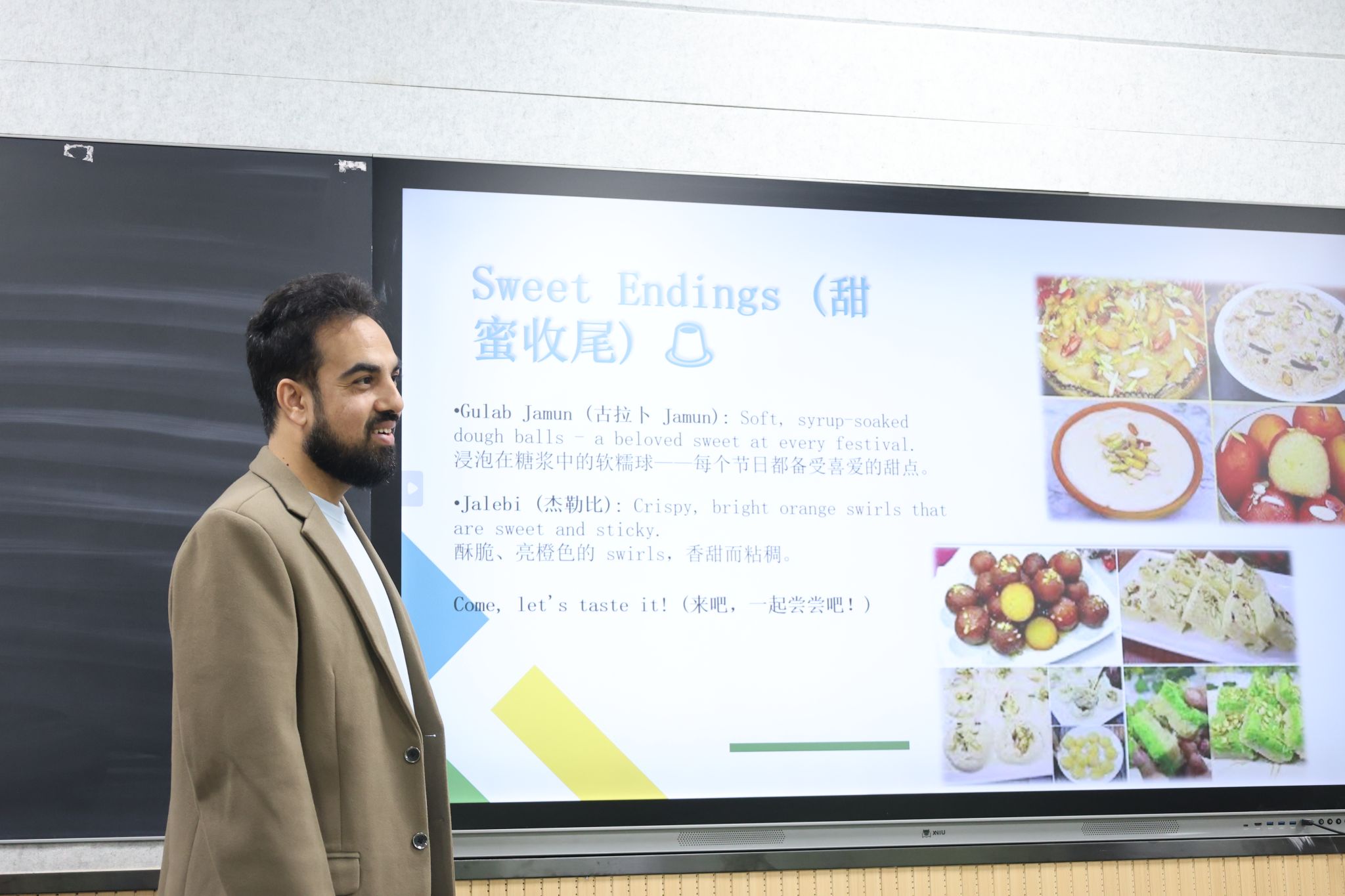 在近期举办的活动中,经济与管理学院Farman Ullah Khan副教授以“美食之桥:探寻‘一带一路’上的中巴饮食文化”为主题,带领同学们深入品味巴基斯坦的饮食传统与餐桌礼仪,并探讨中巴经济走廊如何作为新时代的“味道丝绸之路”,促进两国食材与文化交融。他强调,美食不仅是味觉的享受,更是“民心相通”的生动体现,承载着融合、友谊与创新的时代内涵。