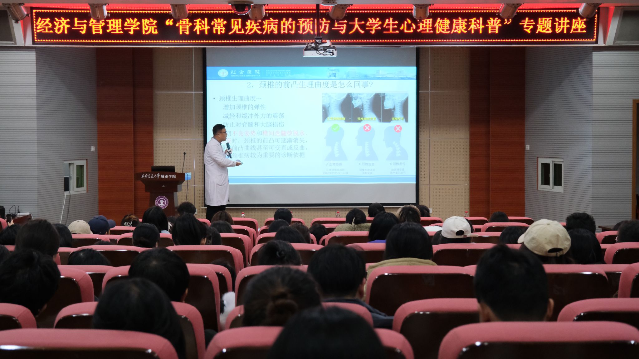 为切实提升学生健康防护意识与应急自救能力,筑牢校园健康安全防线,12月25日晚,经济与管理学院联合红会医院举办安全健康科普讲座。红会医院皮肤科与医疗美容科袁旭博士、骨创伤医院上肢科王晓龙医生受邀担任主讲嘉宾。